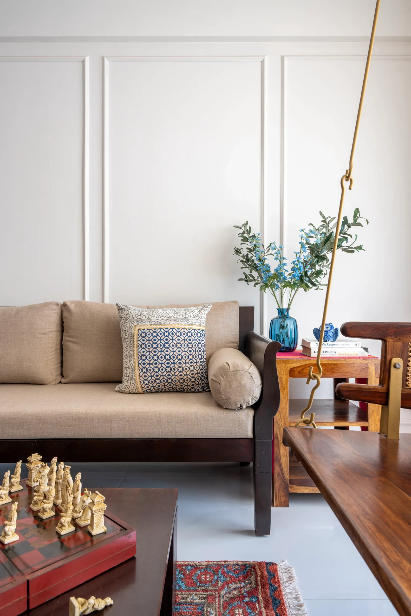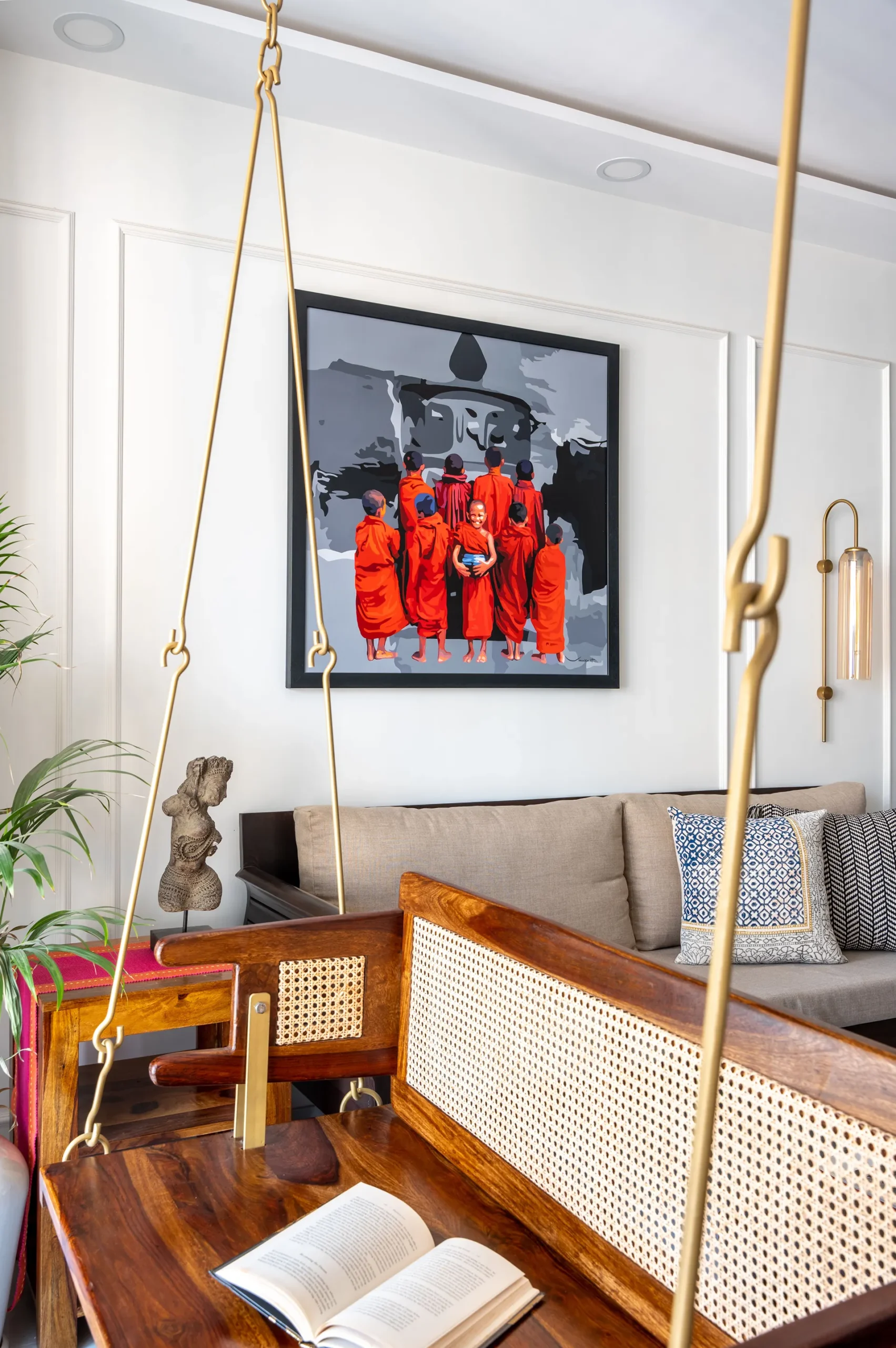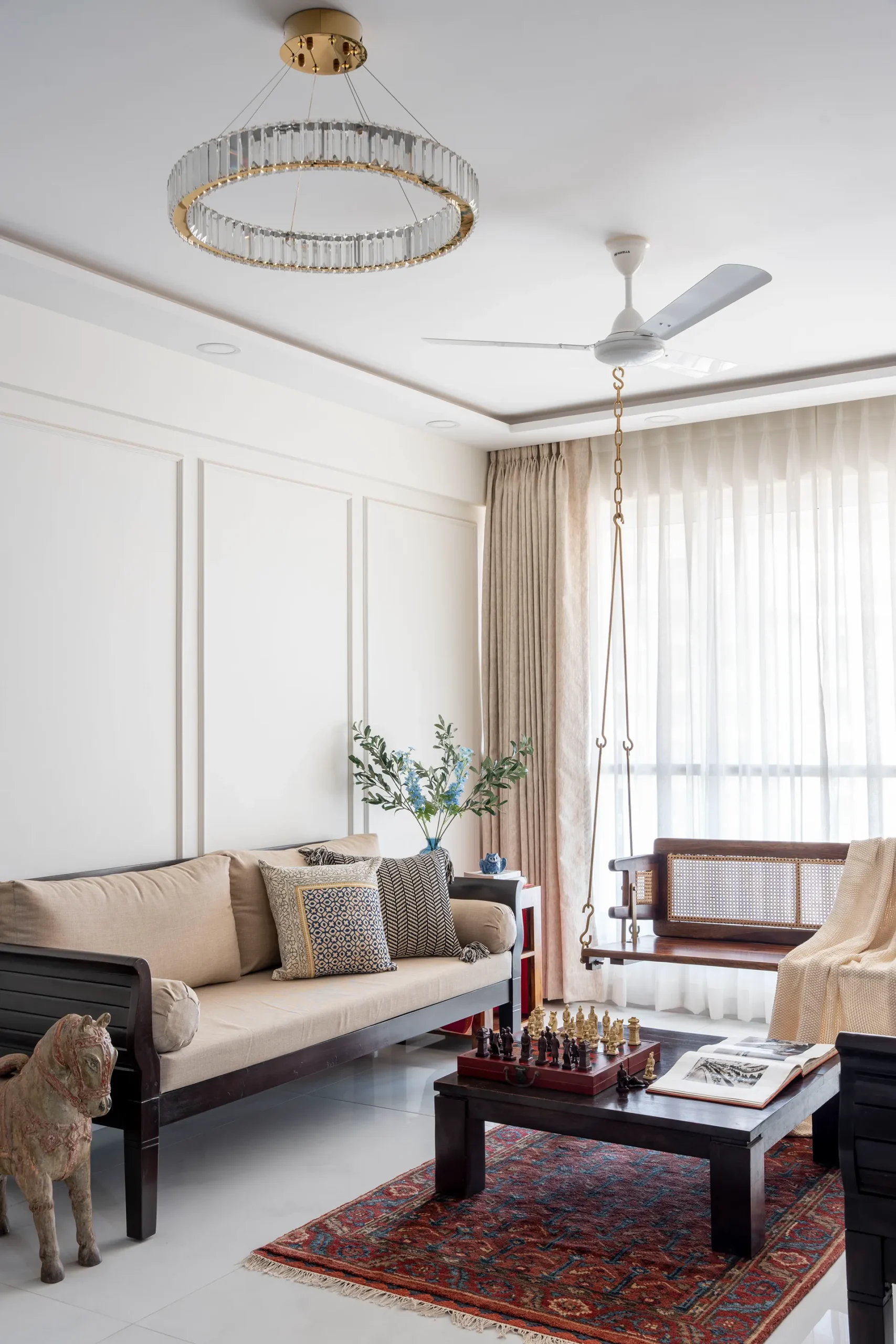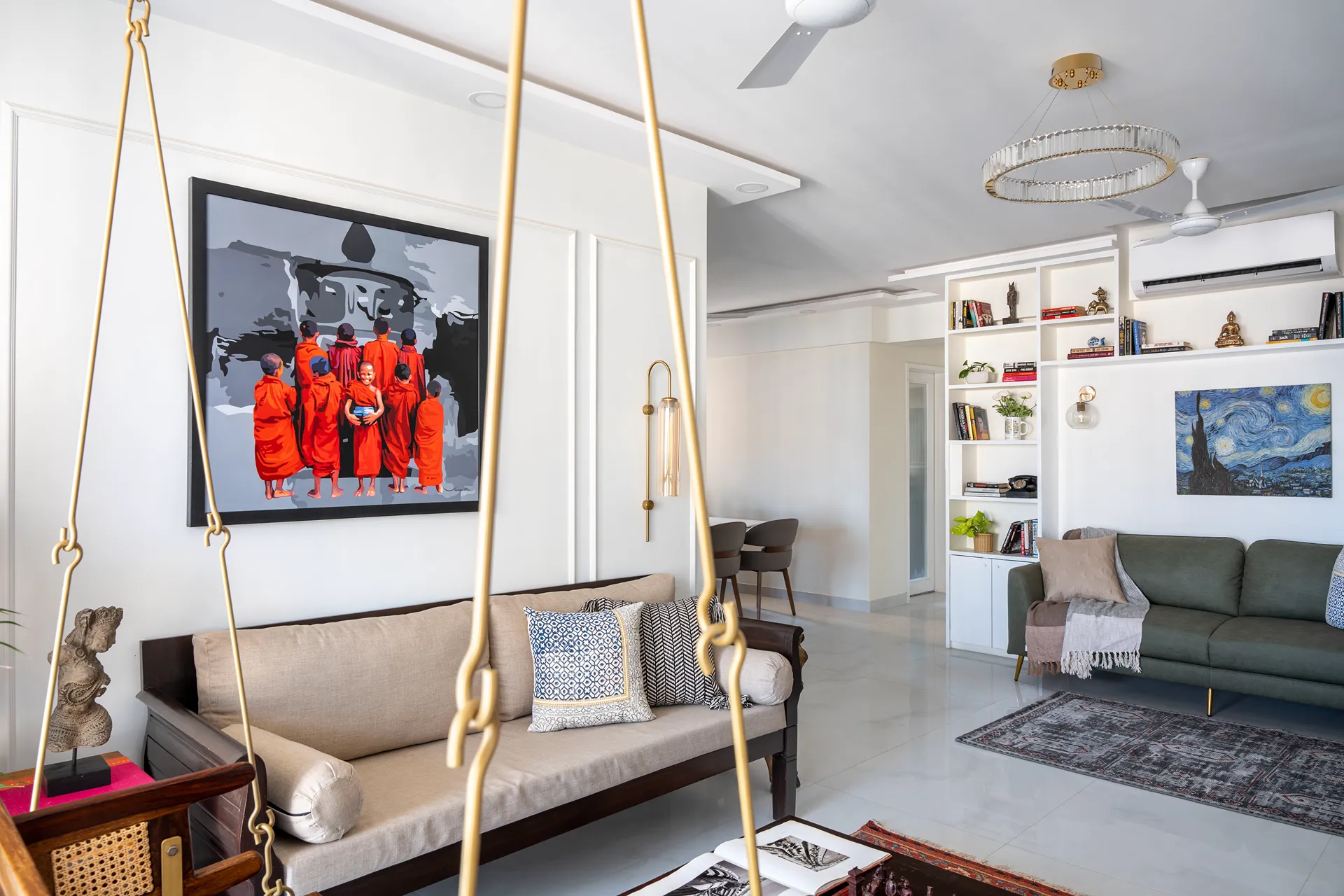 The living room has a soothing vibe where everything is in whites and light tone. The space is visually divided into two sections, one is the formal seating and one is the informal seating. The focal point of the hall is the jhula that client wanted right from the start. We turned this element into one of the highlights of the house. Two sofas sit on either side with the jhula in the front. The jhula is reversible, so it can face the sofa side as well as the window side whenever needed. On the opposite side is the informal seating with a sofa that is embedded in a wall with niches that can have books, accessories, and curios, where they curate whatever they pick up from their travels. Colors in the room are added through the paintings, the rugs and the accessories.
