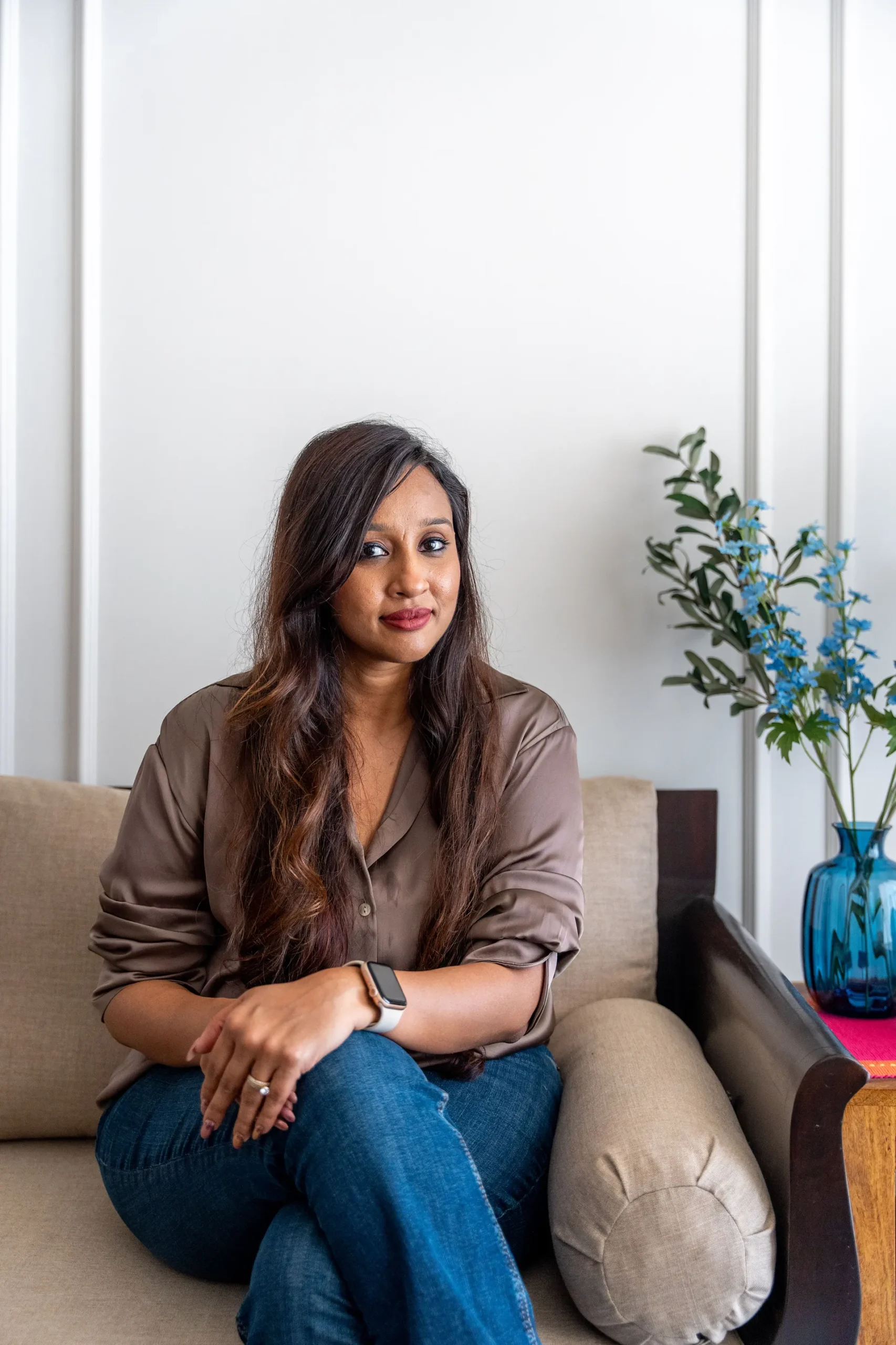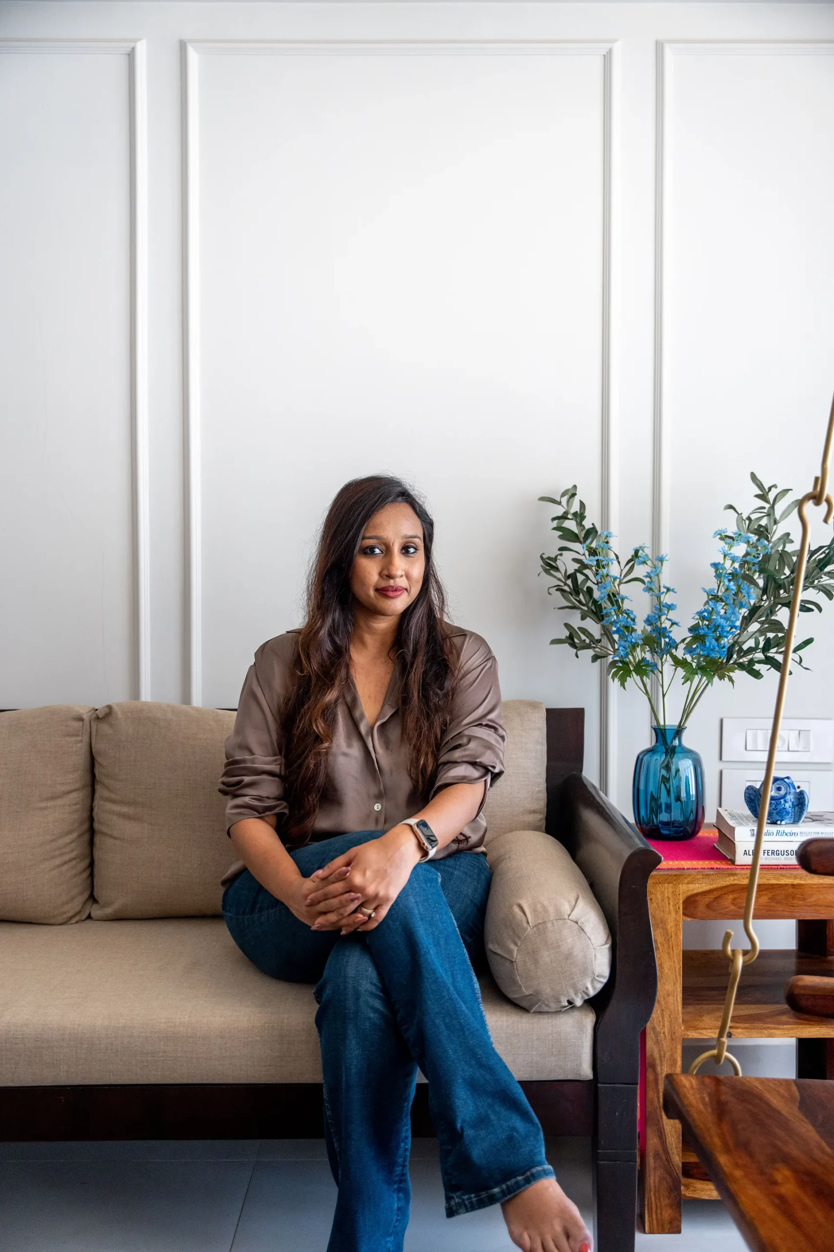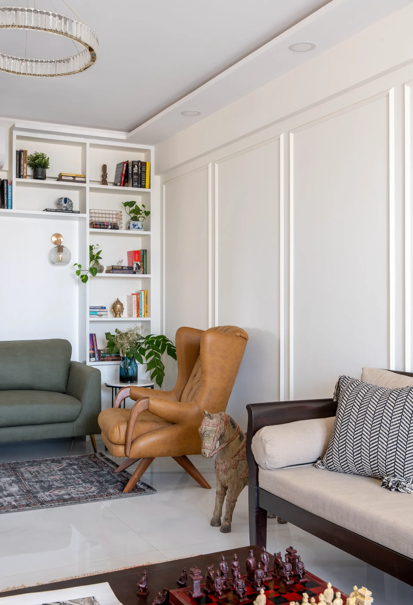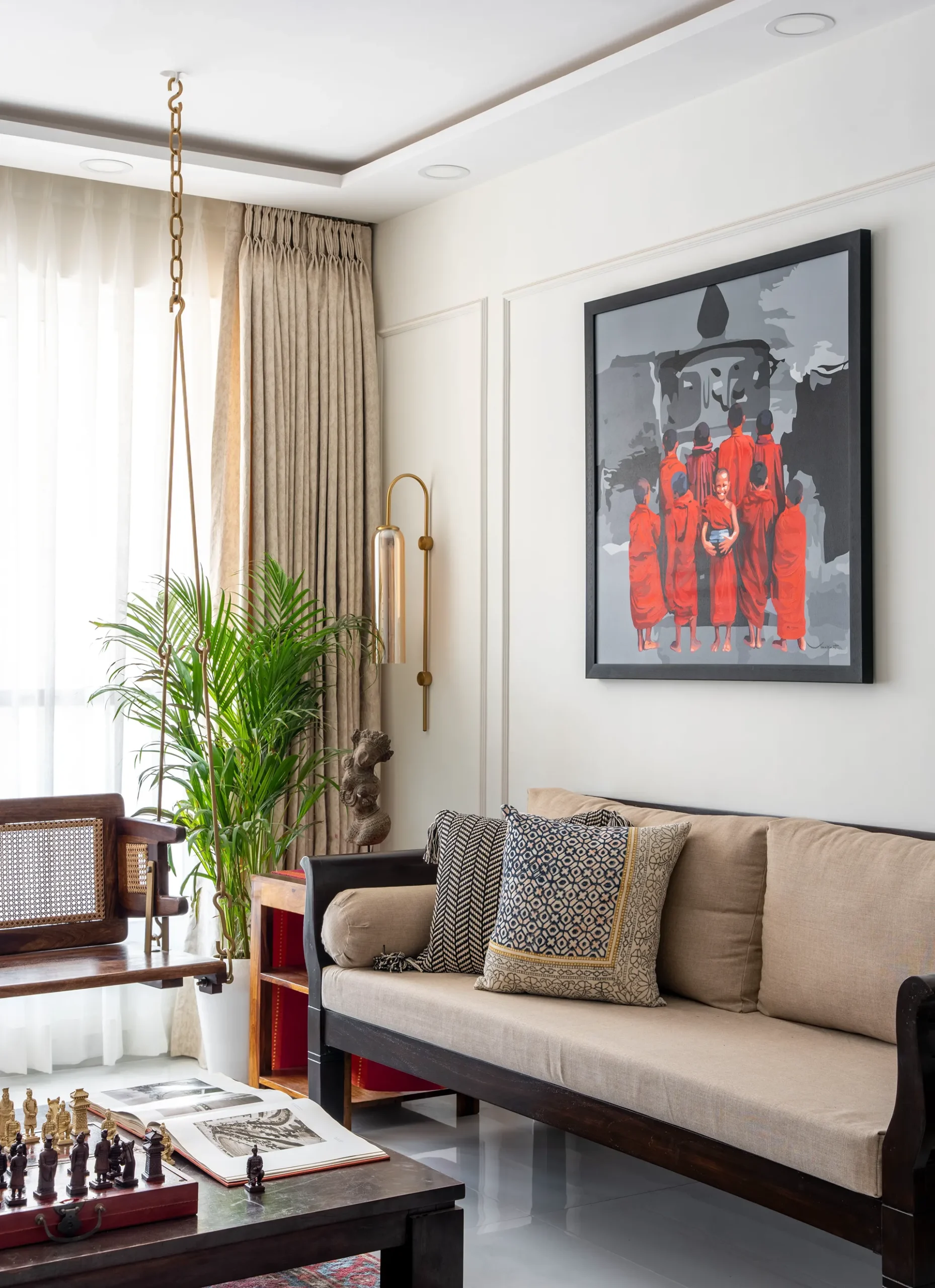 The living room has a soothing vibe where everything is in whites and light tone. The space is visually divided into two sections, one is the formal seating and one is the informal seating. The focal point of the hall is the jhula that client wanted right from the start. We turned this element into one of the highlights of the house. Two sofas sit on either side with the jhula in the front. The jhula is reversible, so it can face the sofa side as well as the window side whenever needed. On the opposite side is the informal seating with a sofa that is embedded in a wall with niches that can have books, accessories, and curios, where they curate whatever they pick up from their travels. Colors in the room are added through the paintings, the rugs and the accessories.