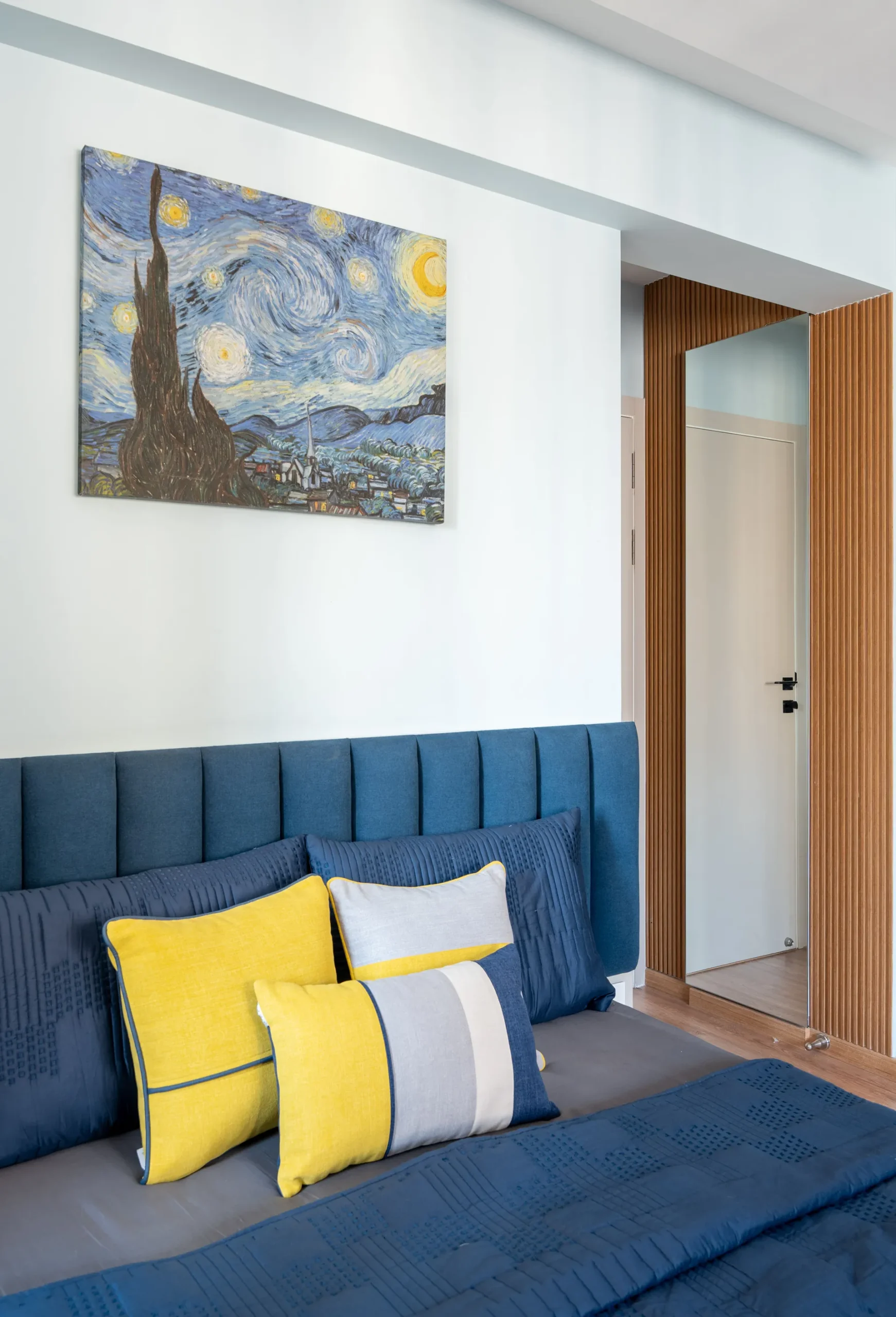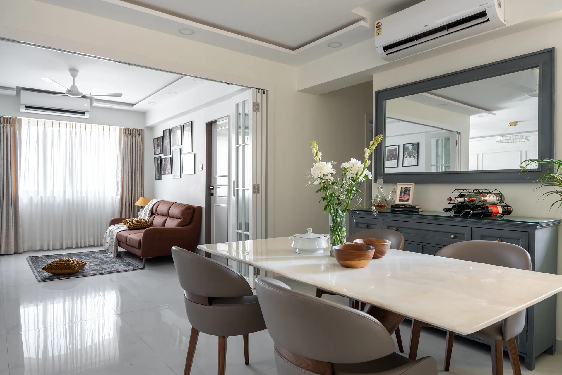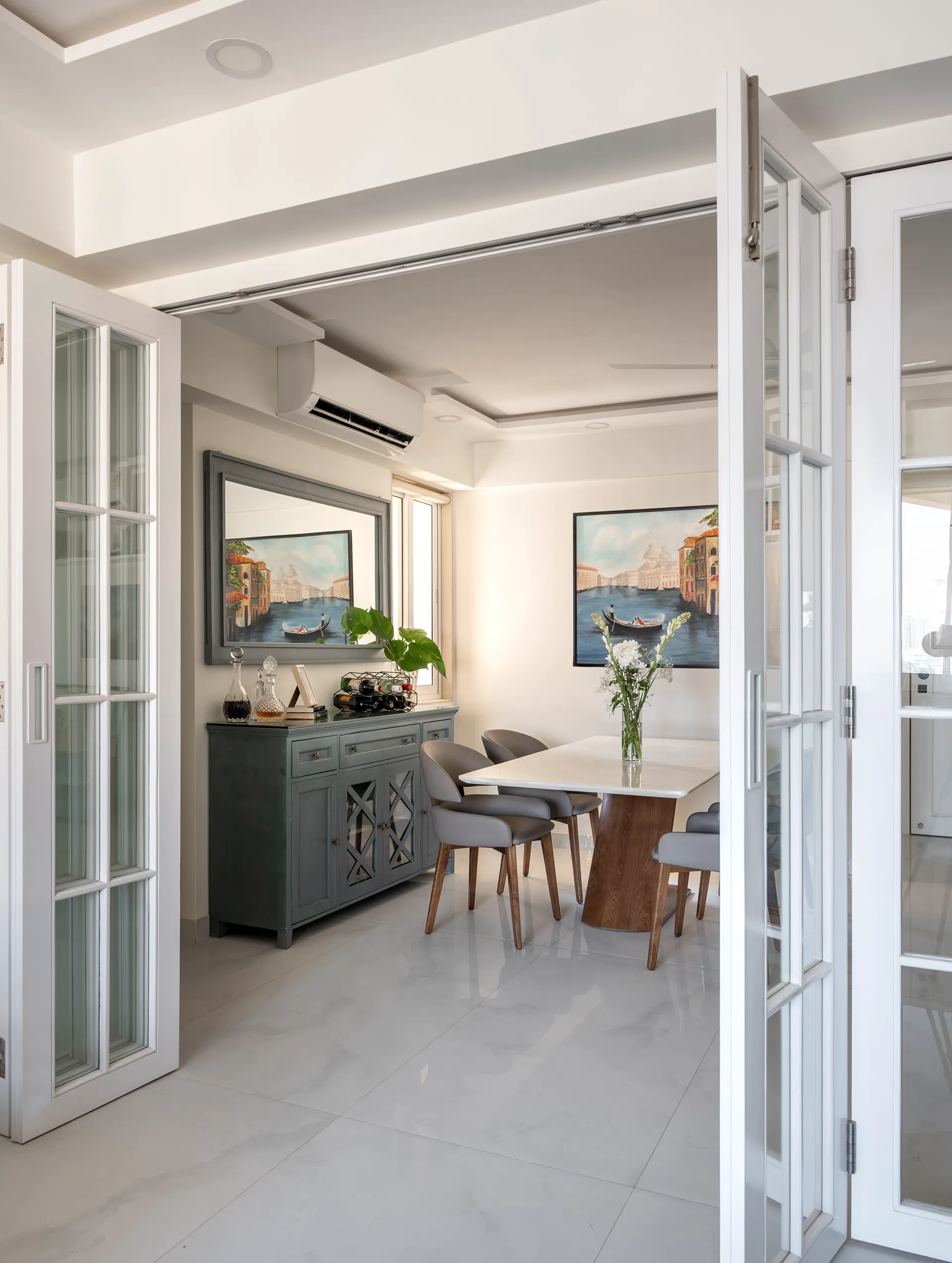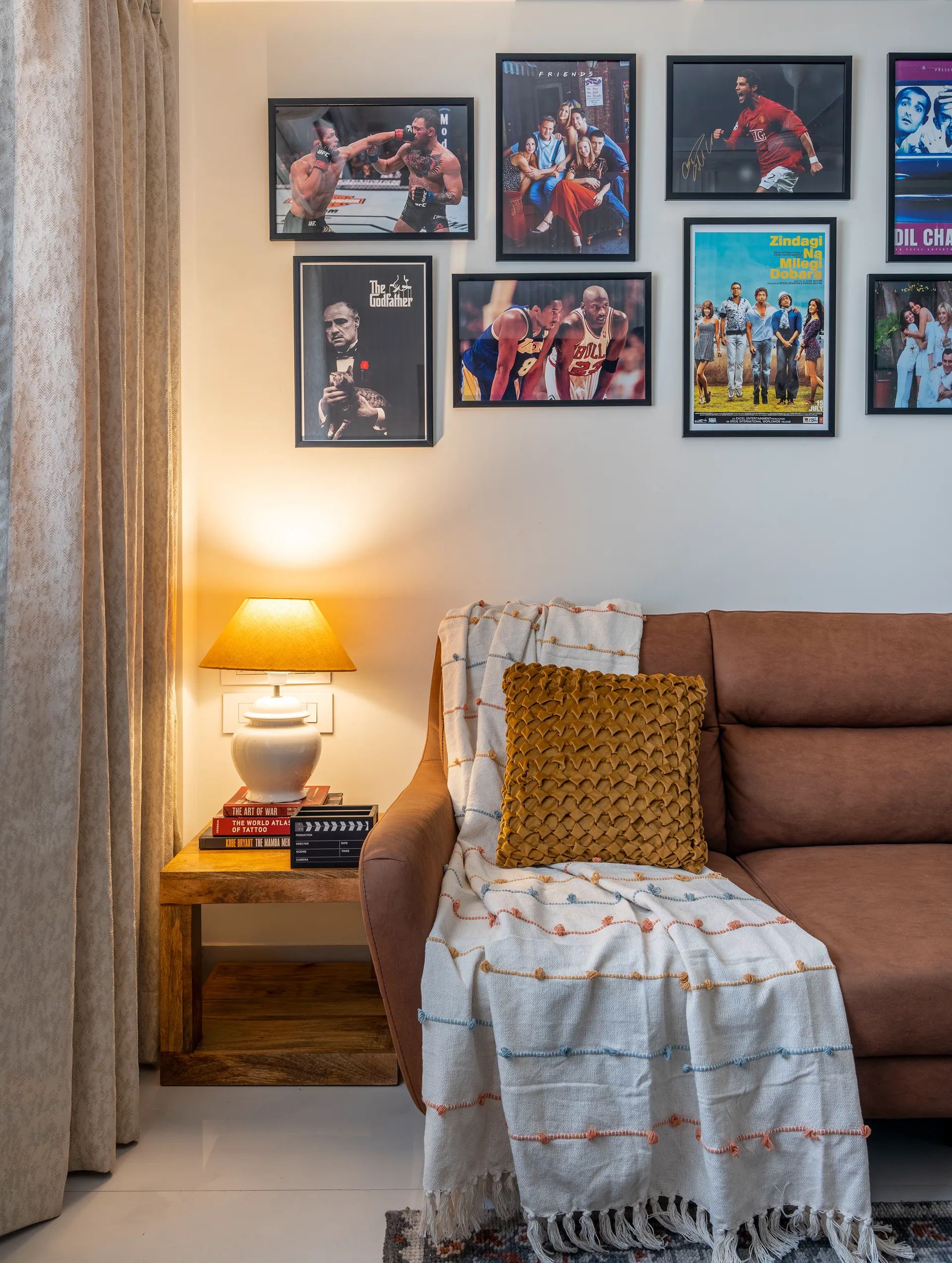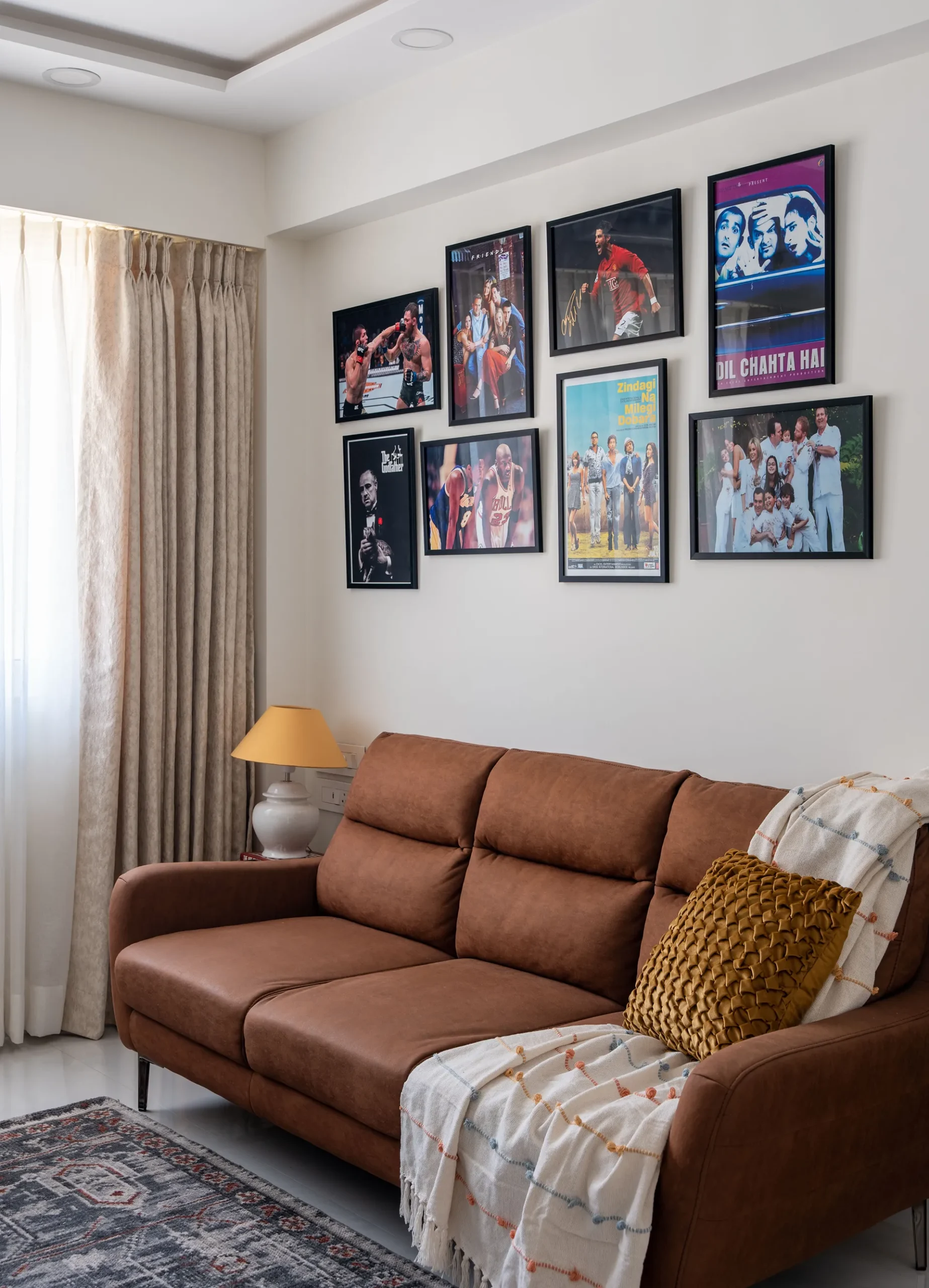 The client is a family of three, so the design team broke open the walls of one room and merged it with the living room and gave a folding sliding partition. This makes the room look spacious and it also converts into a guest room when there are guests. Otherwise, it is a part of the living space which acts as a den and entertainment zone where they can watch their matches and play music on piano. There are also photographs of the movies they watch together around the sofa, so it is a very private area that they share with their family and friends.