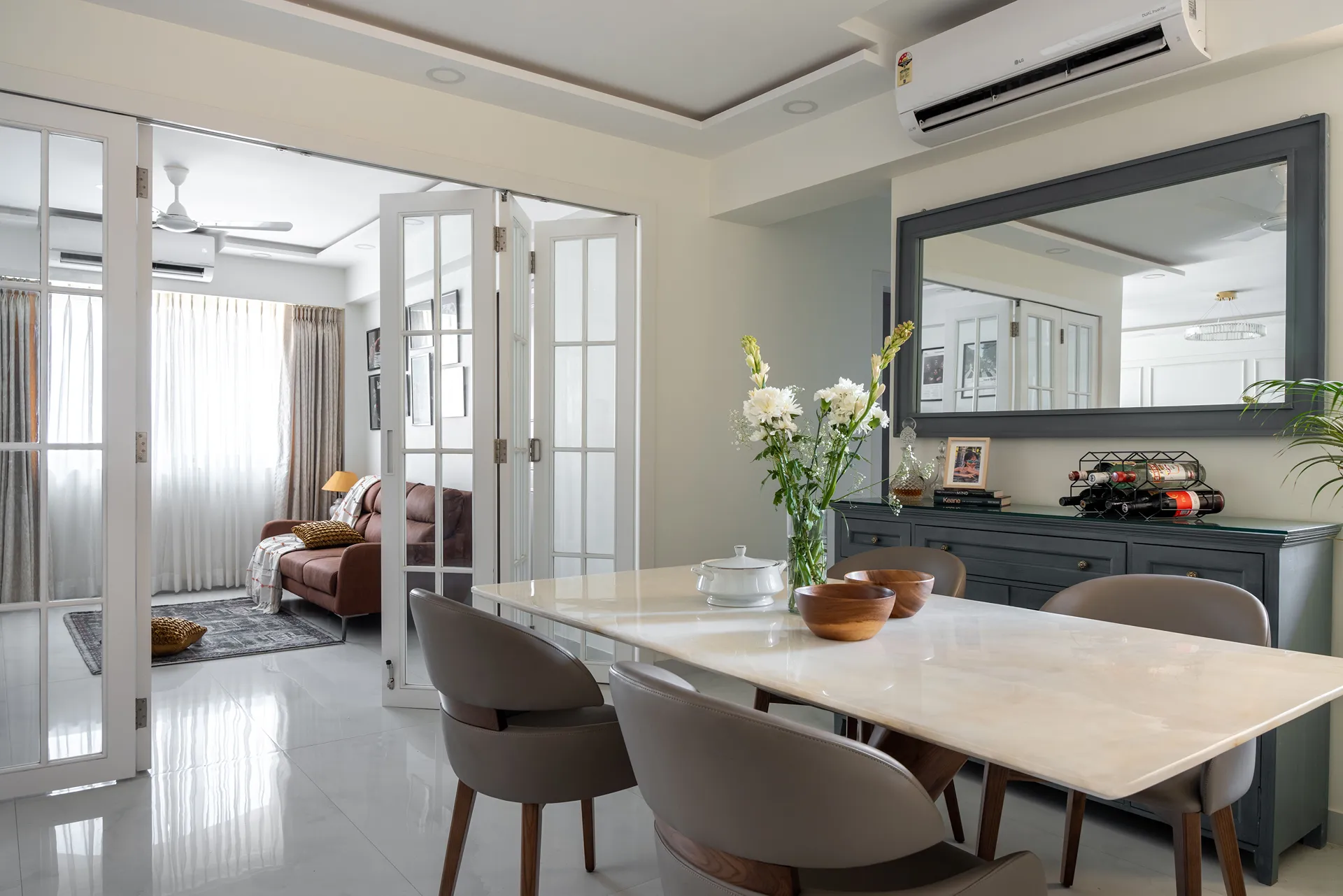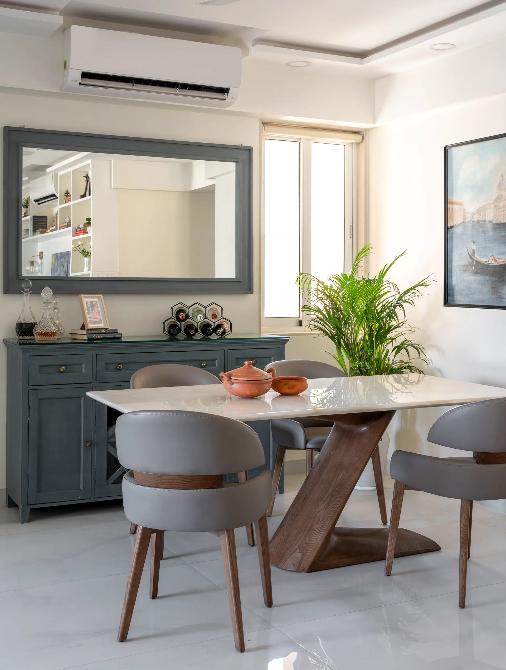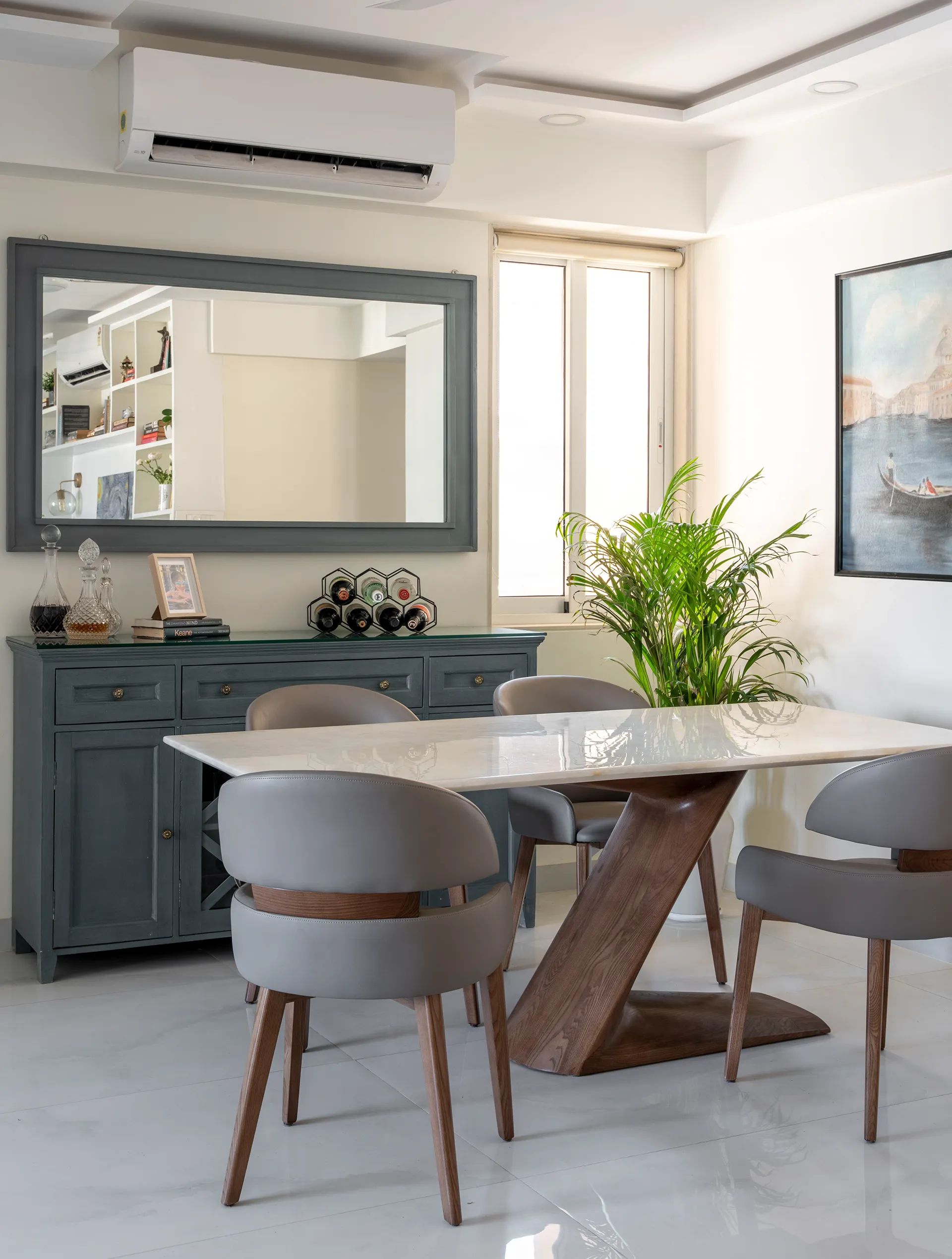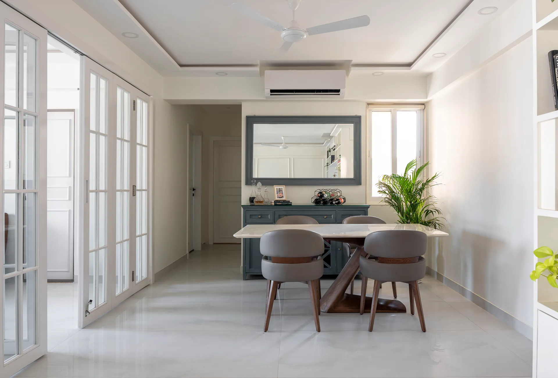 The main highlight of the house is the main door, which is nice and stylish in grey with black accent. On the side is a white brick wall which becomes a very appealing entrance to the house. As we walk in, the first thing that appears in the house on the right side is the kitchen, which is done in a clean and minimalistic way. We have used neutral colors to make the space look larger. Everything here is in plain colour except for the beautiful patterned flooring in Spanish style which creates a focal element. We provided a fluted glass door, so there are guests, they will not be able to see inside the kitchen. In front of the kitchen is the living room and on the right side is the dining space. The dining space has sideboard, which is in greyish blue tone with a mirror on top that also acts as a bar cabinet and crockery unit.