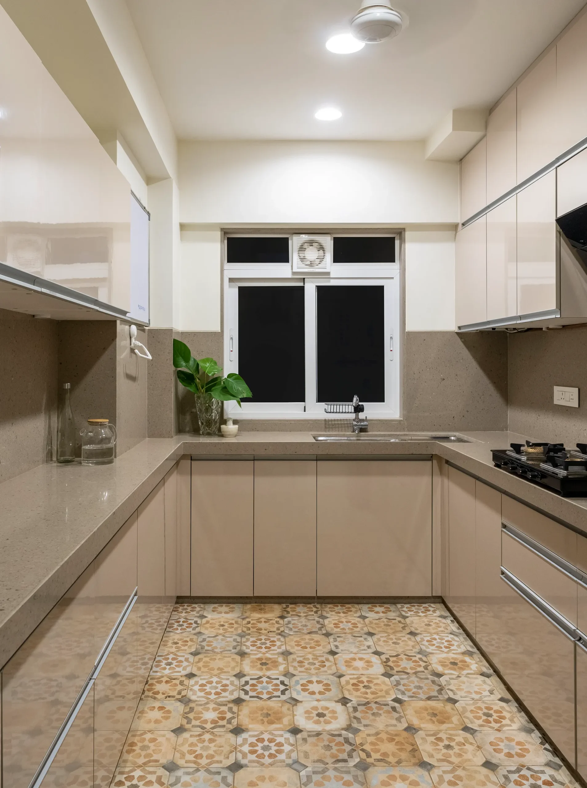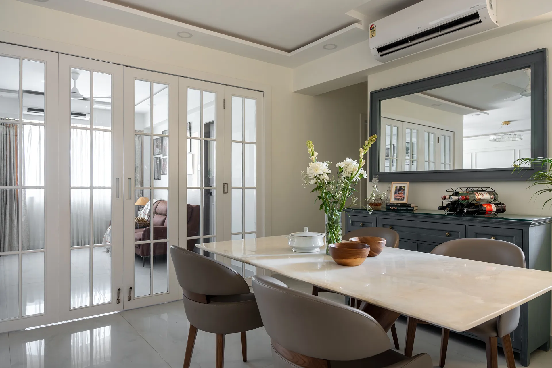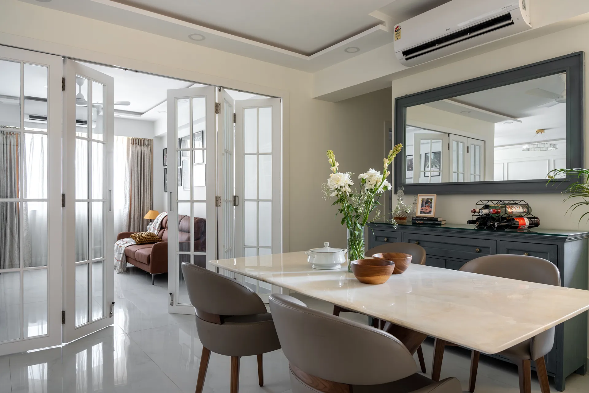 The main highlight of the house is the main door, which is nice and stylish in grey with black accent. On the side is a white brick wall which becomes a very appealing entrance to the house. As we walk in, the first thing that appears in the house on the right side is the kitchen, which is done in a clean and minimalistic way. We have used neutral colors to make the space look larger. Everything here is in plain colour except for the beautiful patterned flooring in Spanish style which creates a focal element. We provided a fluted glass door, so there are guests, they will not be able to see inside the kitchen. In front of the kitchen is the living room and on the right side is the dining space. The dining space has sideboard, which is in greyish blue tone with a mirror on top that also acts as a bar cabinet and crockery unit.