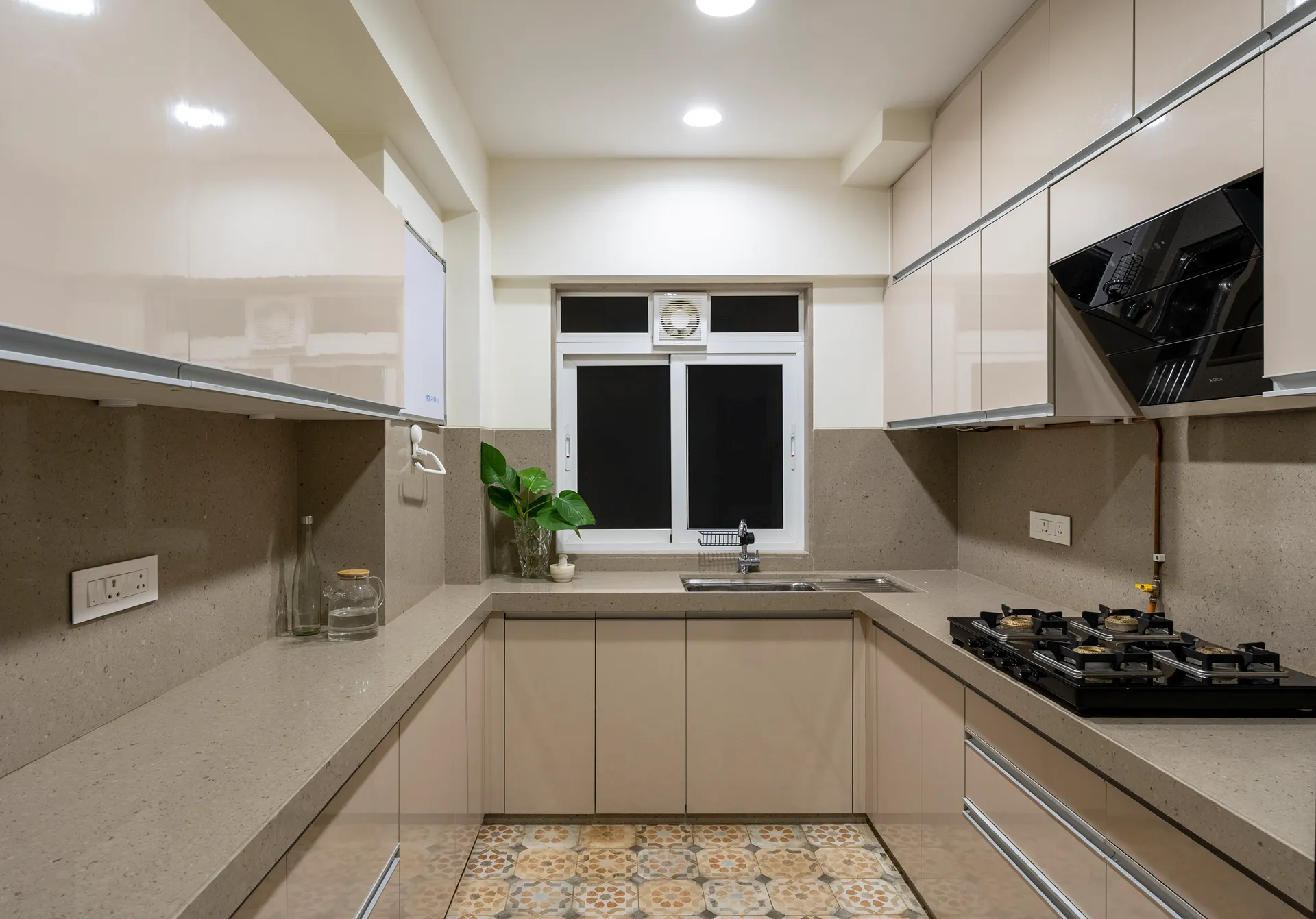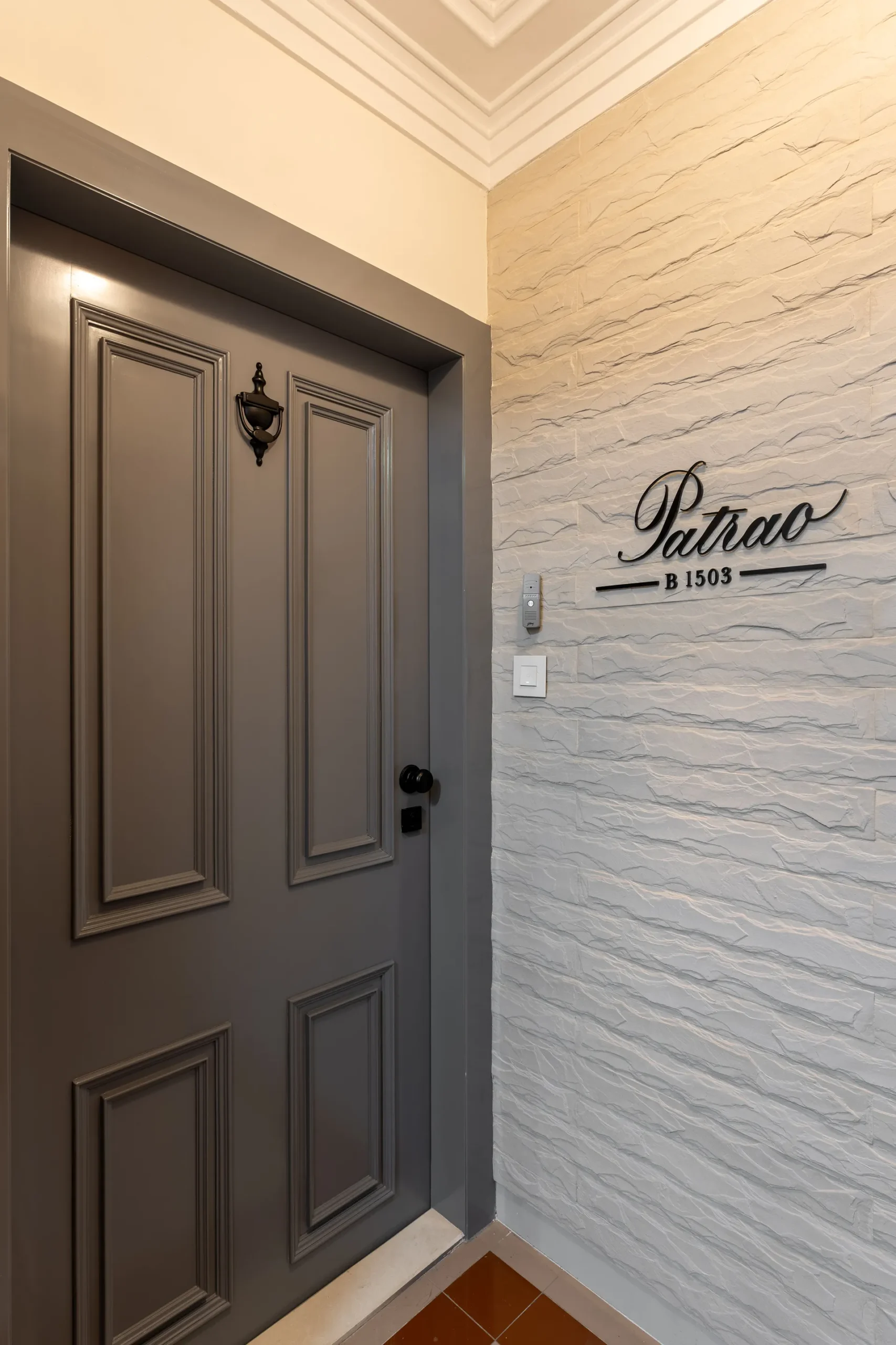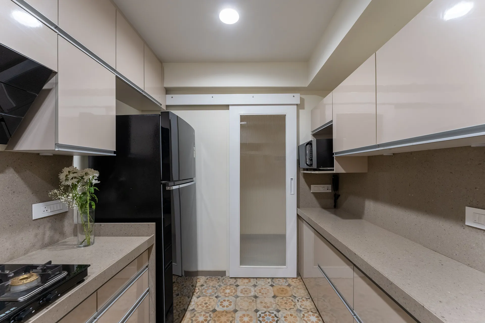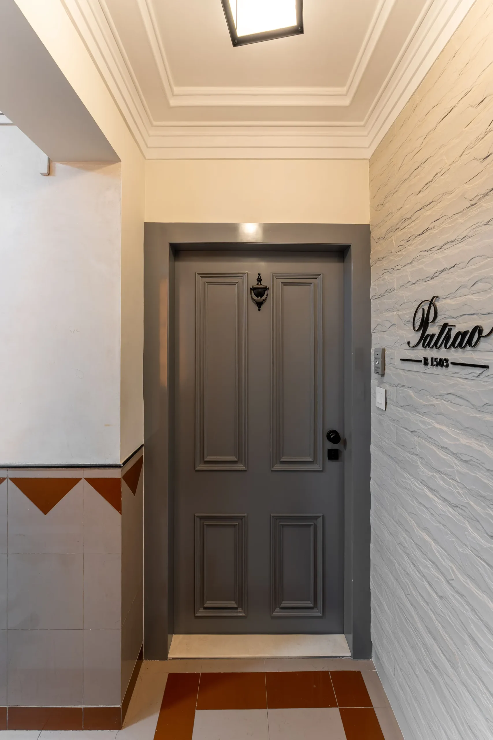 The main highlight of the house is the main door, which is nice and stylish in grey with black accent. On the side is a white brick wall which becomes a very appealing entrance to the house. As we walk in, the first thing that appears in the house on the right side is the kitchen, which is done in a clean and minimalistic way. We have used neutral colors to make the space look larger. Everything here is in plain colour except for the beautiful patterned flooring in Spanish style which creates a focal element. We provided a fluted glass door, so there are guests, they will not be able to see inside the kitchen. In front of the kitchen is the living room and on the right side is the dining space. The dining space has sideboard, which is in greyish blue tone with a mirror on top that also acts as a bar cabinet and crockery unit.