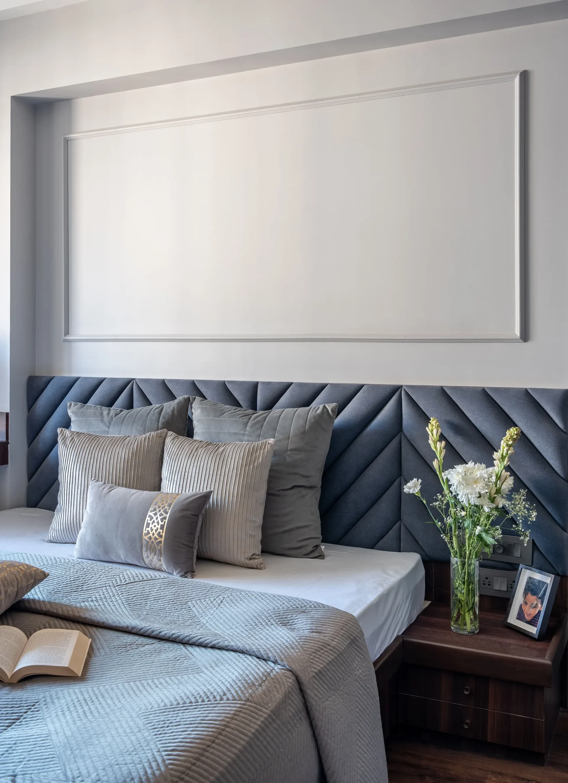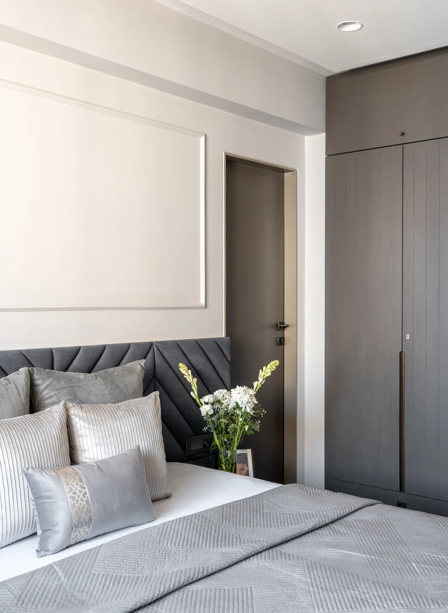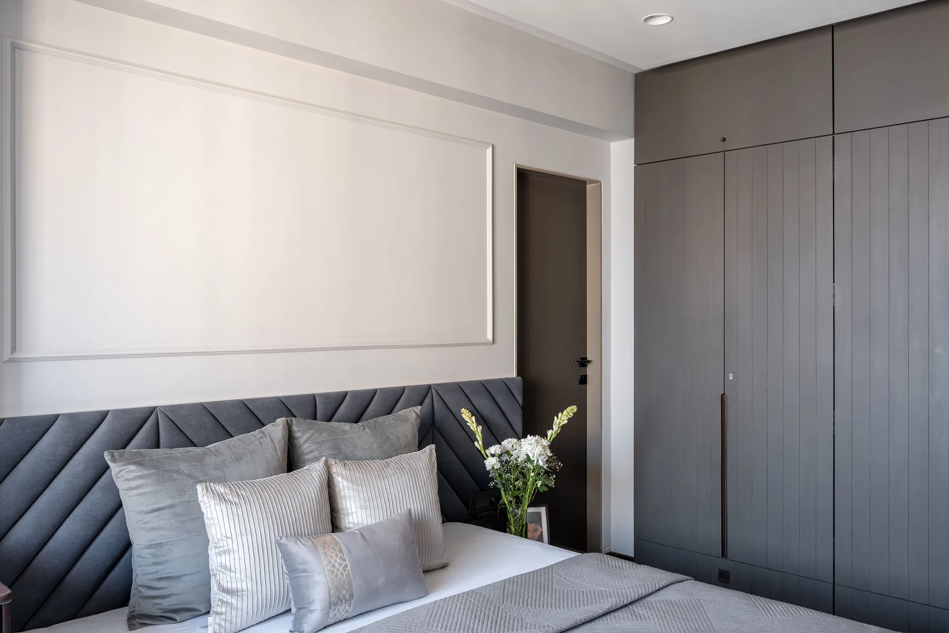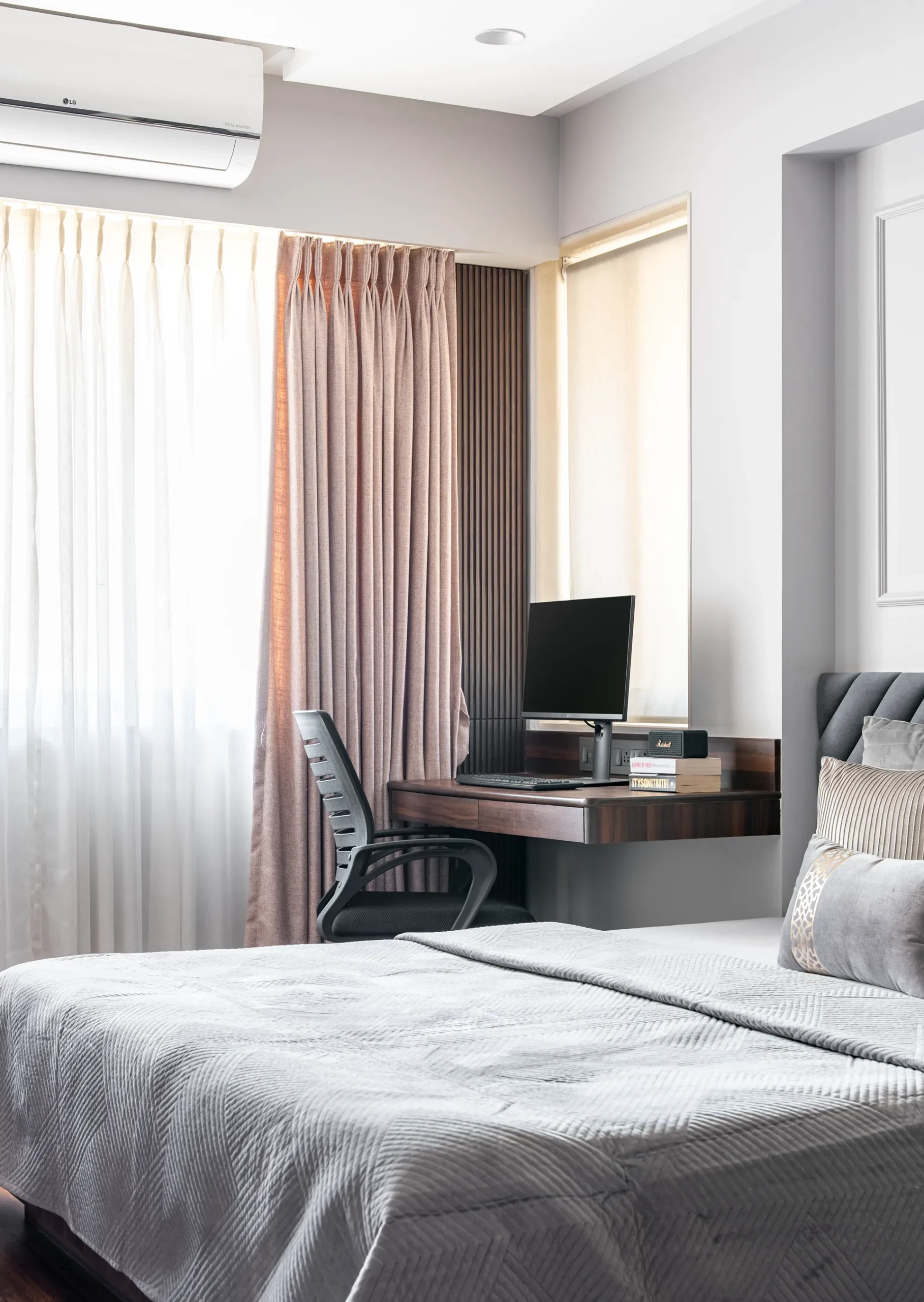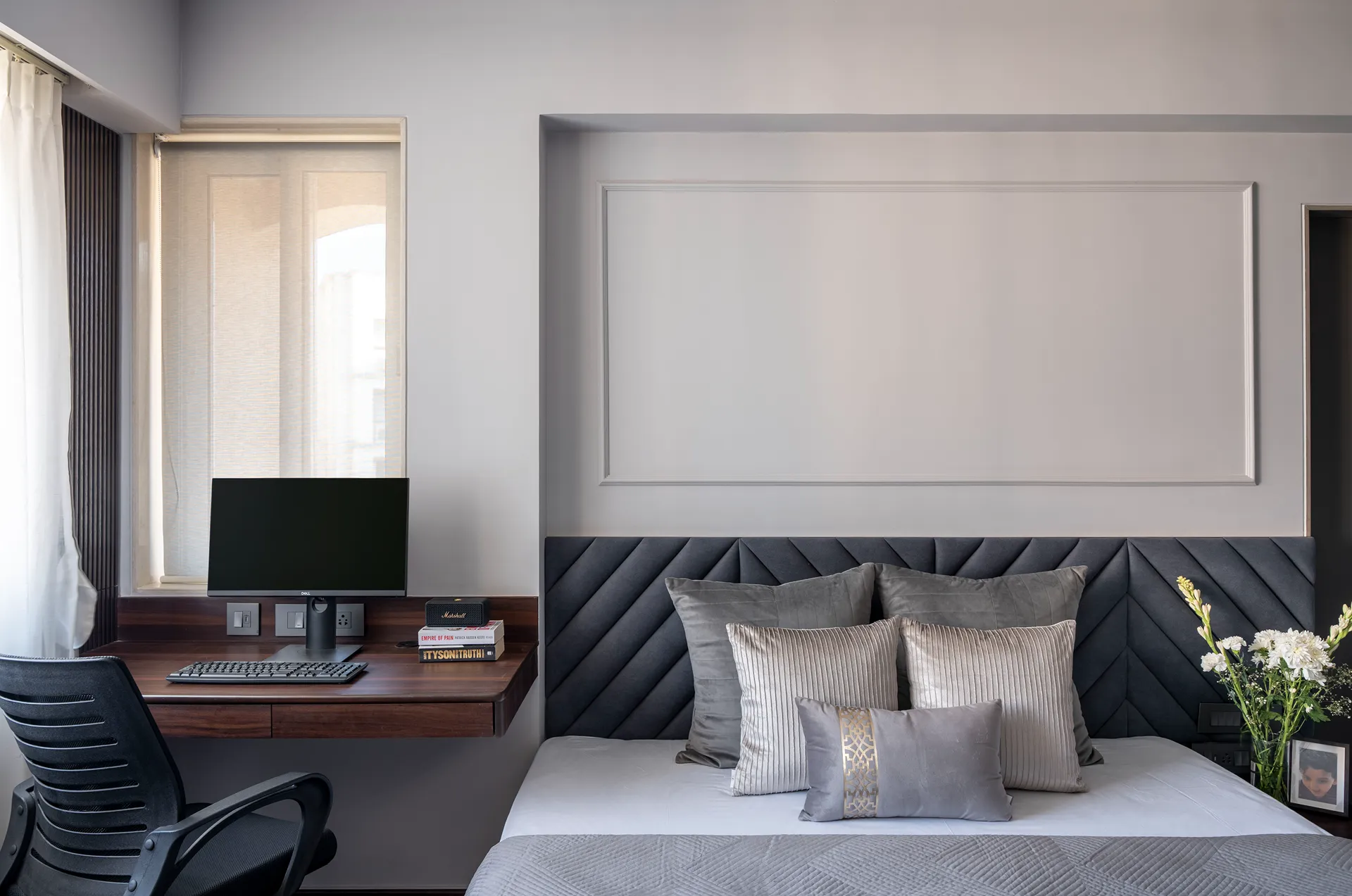 In the master bedroom, the clients wanted a very clean looking room with minimal things. So there is a TV, a very plain headboard, and study on one side and wardrobes on the other side. The room has neutral tones of grey and brown. The bathroom has tones of beige.