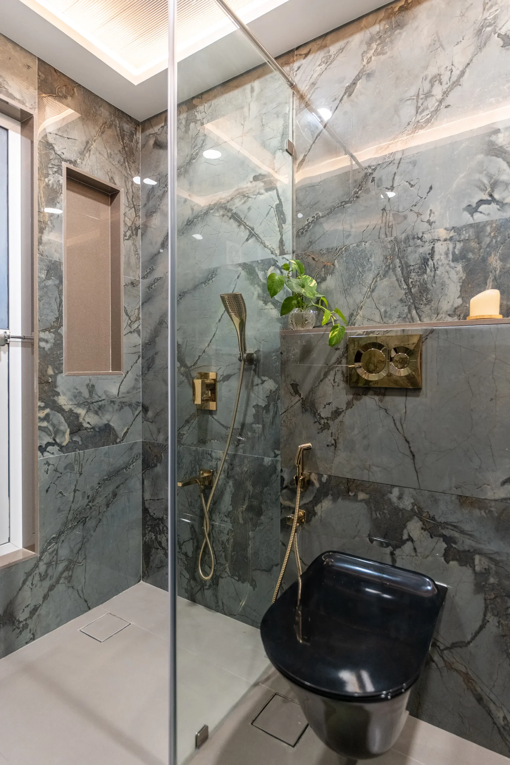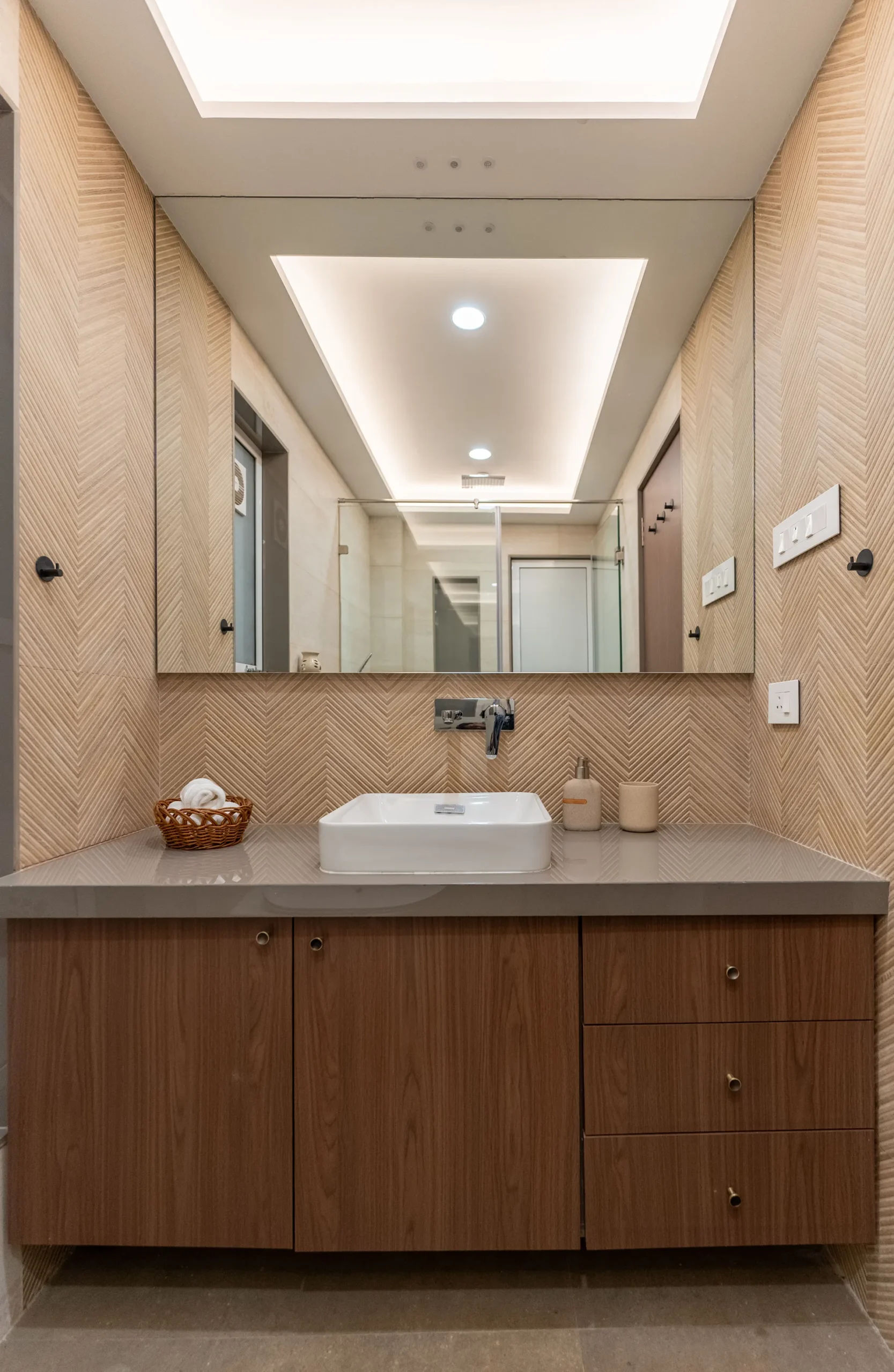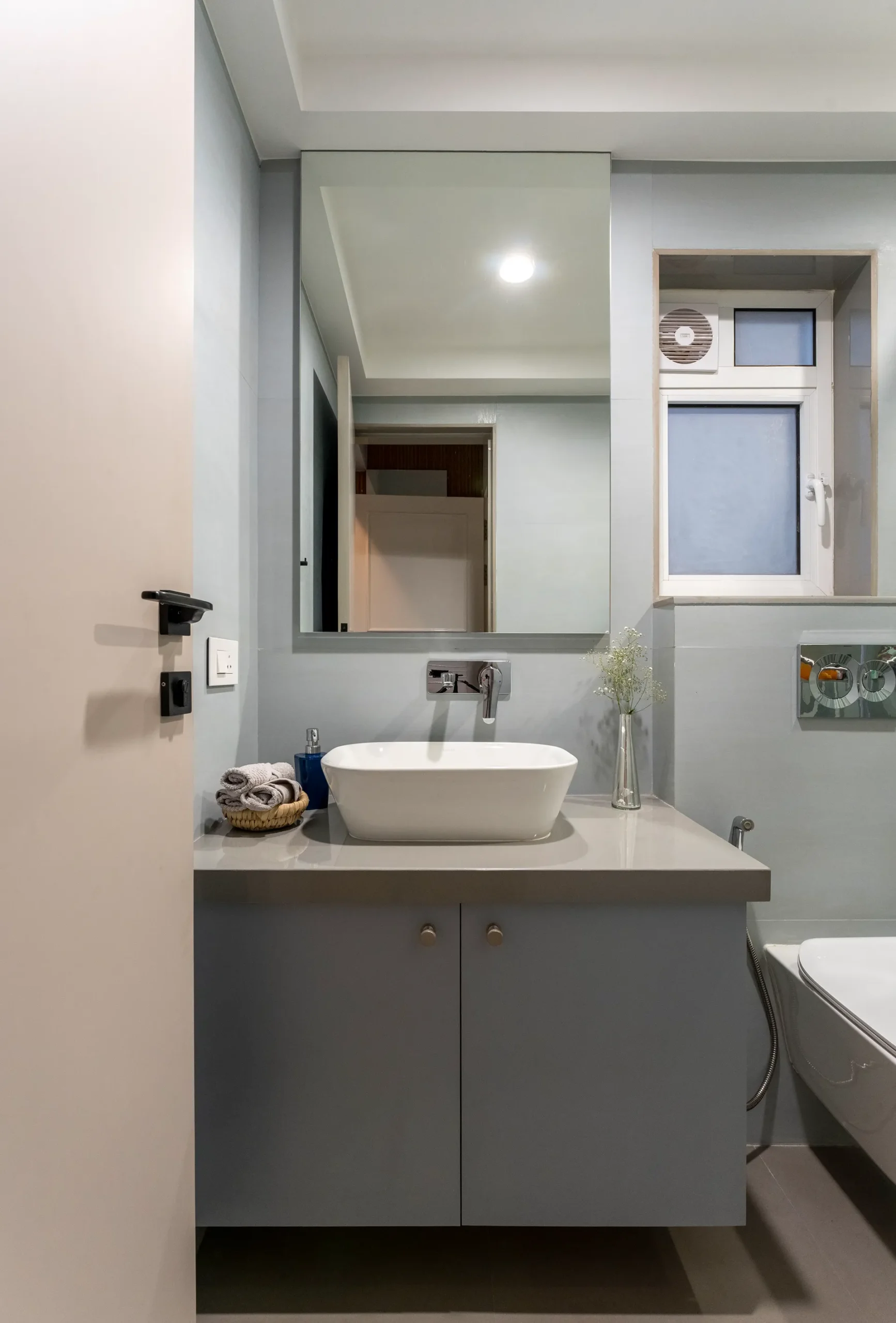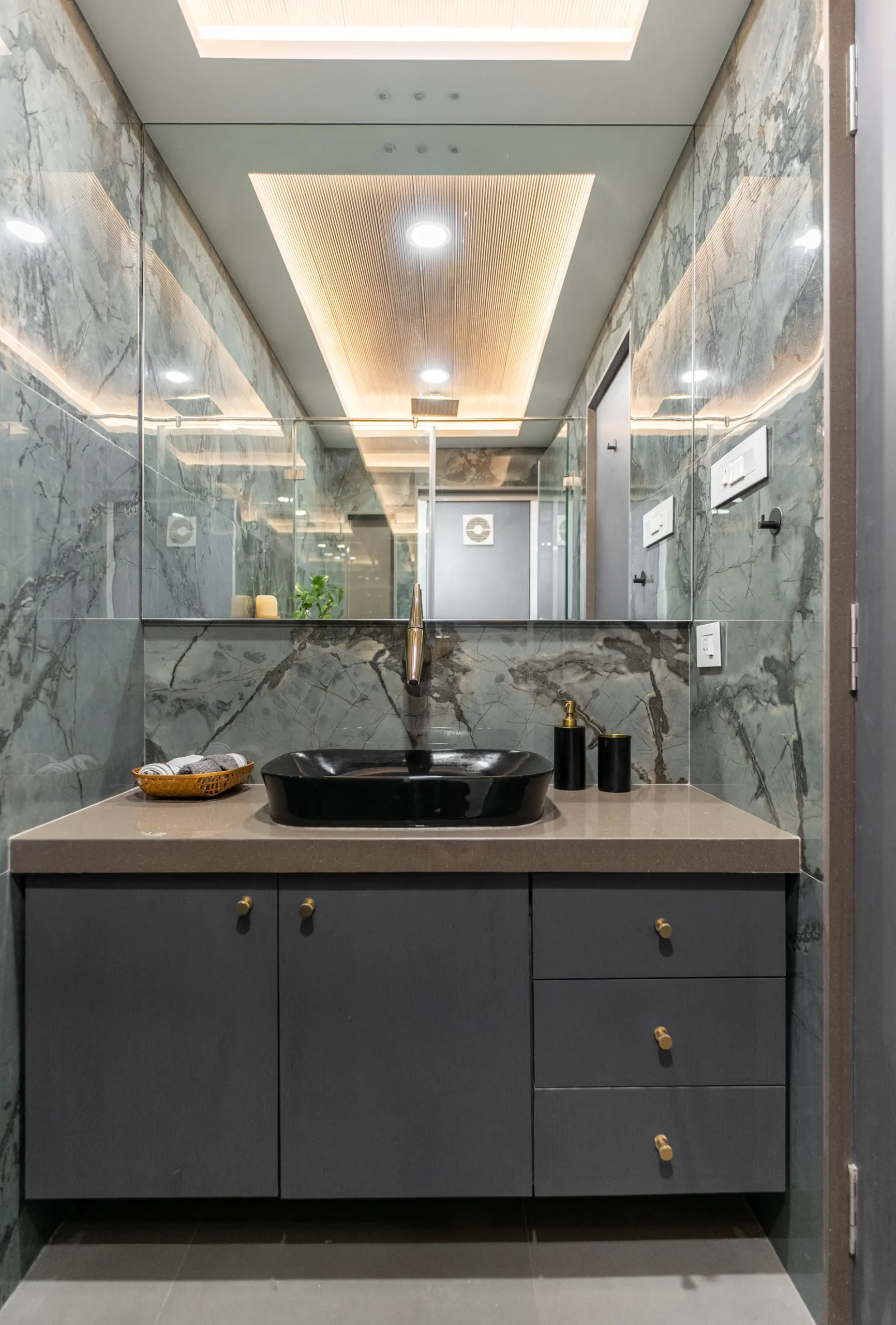 The daughter’s bedroom has an interesting combination of blue, beige and white tones because of her love for the color blue. We tried to accommodate a lot of storage in the ducts, etc. The wardrobes are finished in PU. The bathroom has shades of blues and greys. The guest bathroom has a very dark vibe with dark toned fittings.