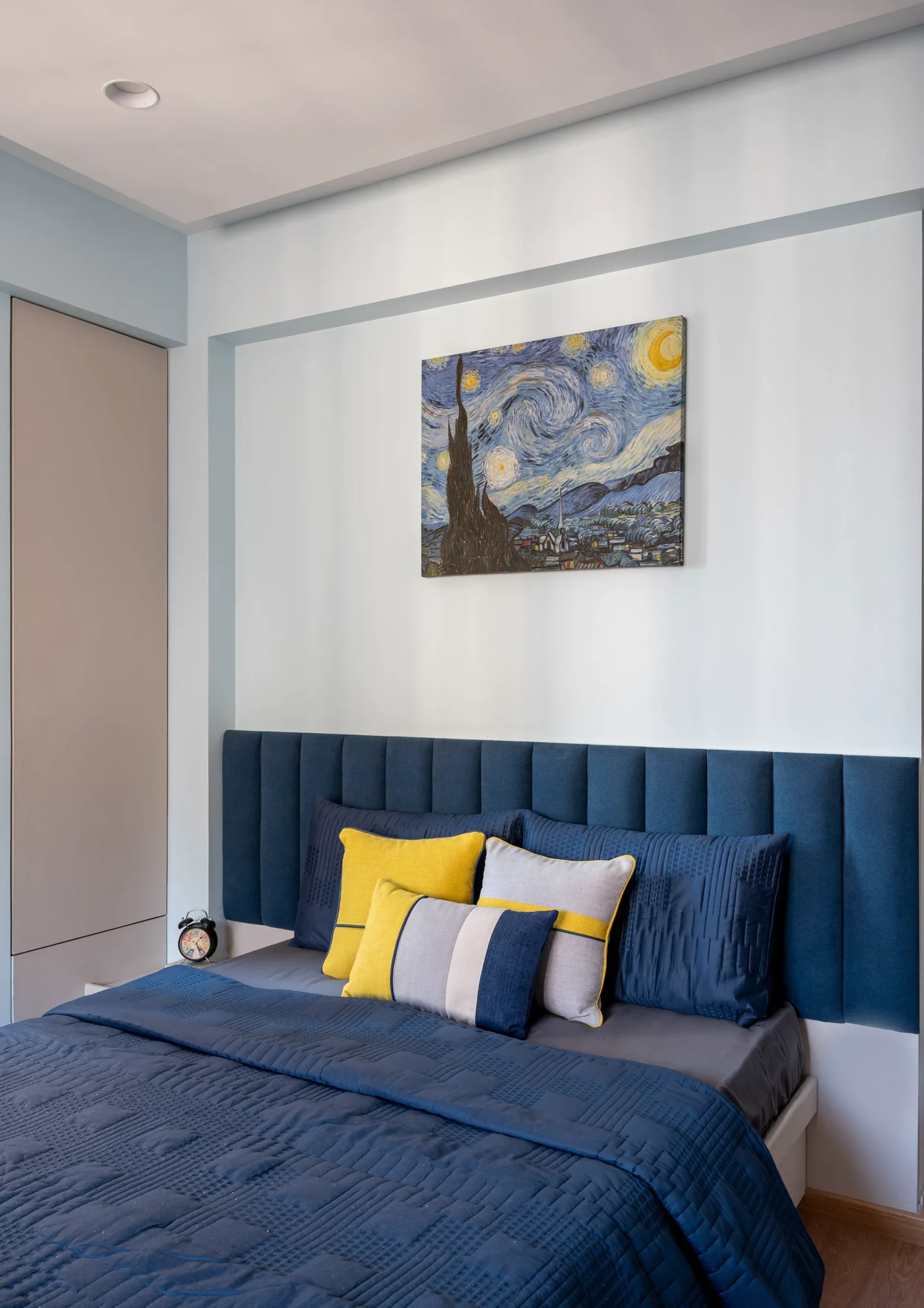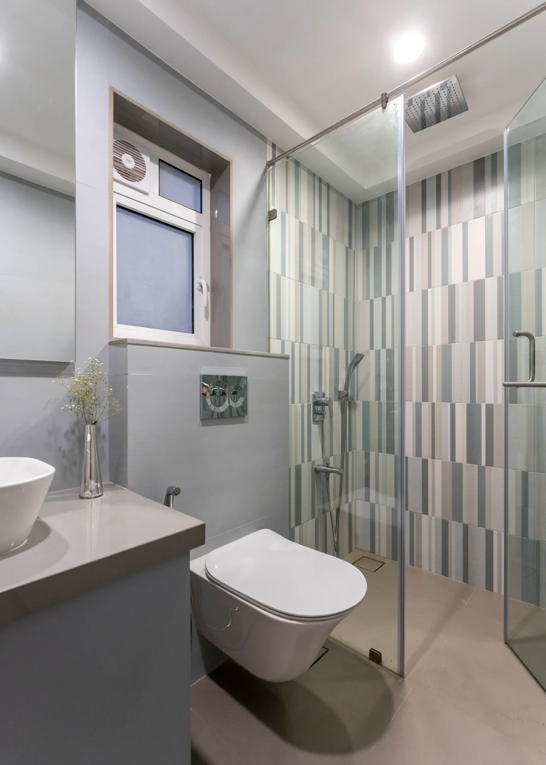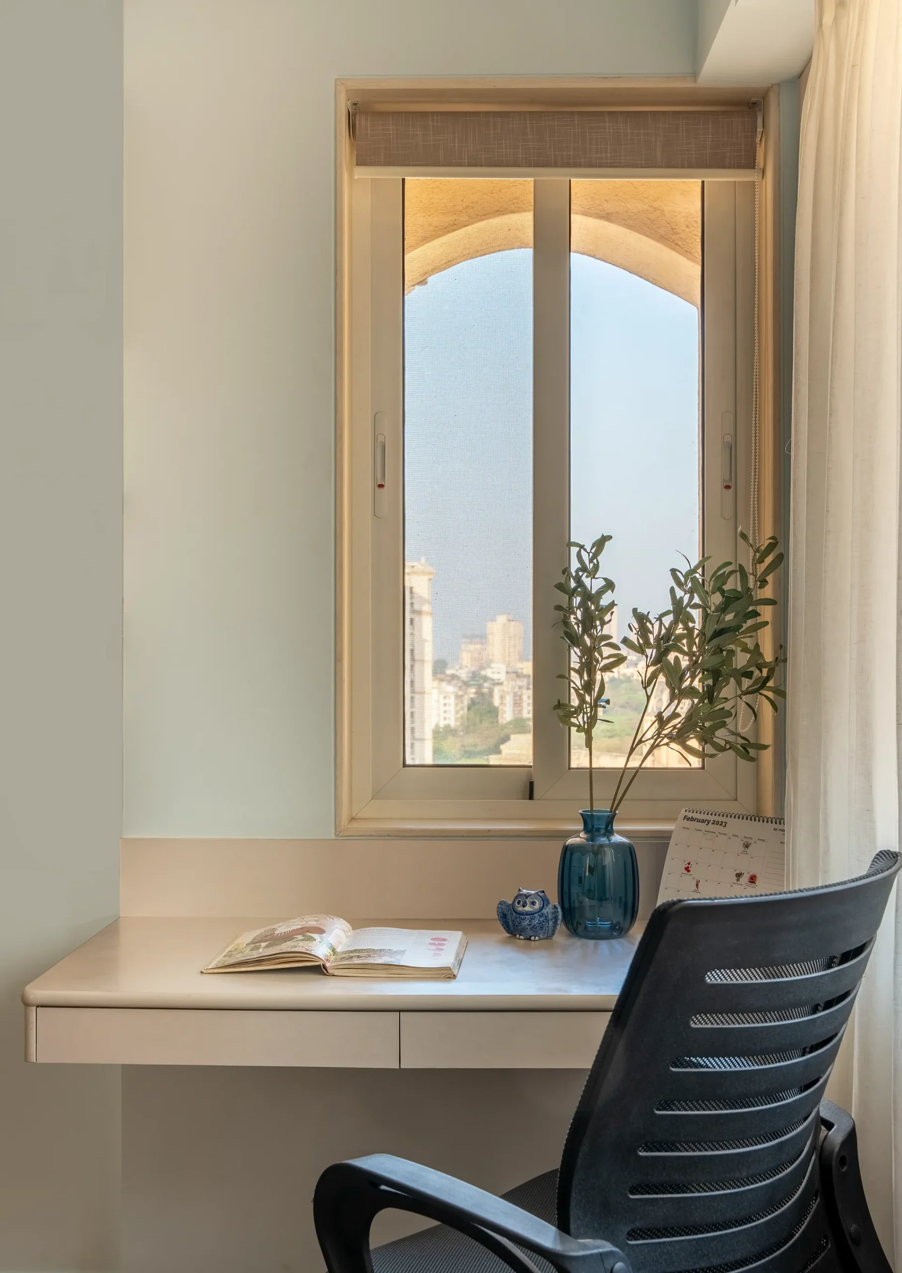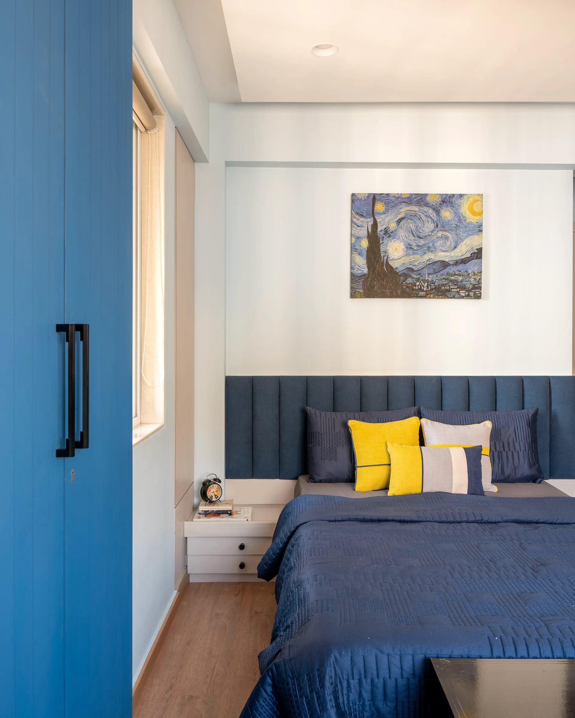 The daughter’s bedroom has an interesting combination of blue, beige and white tones because of her love for the color blue. We tried to accommodate a lot of storage in the ducts, etc. The wardrobes are finished in PU. The bathroom has shades of blues and greys. The guest bathroom has a very dark vibe with dark toned fittings.