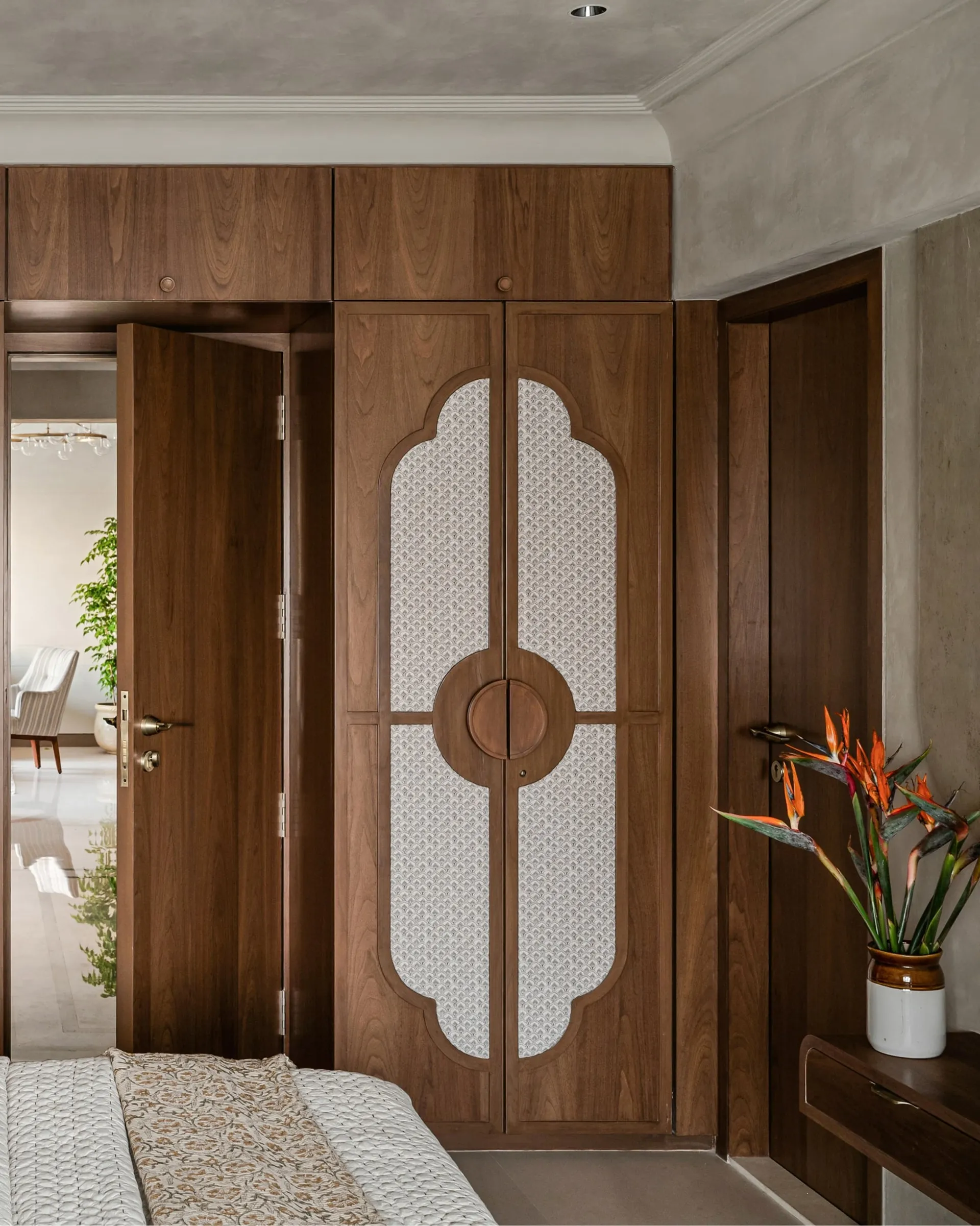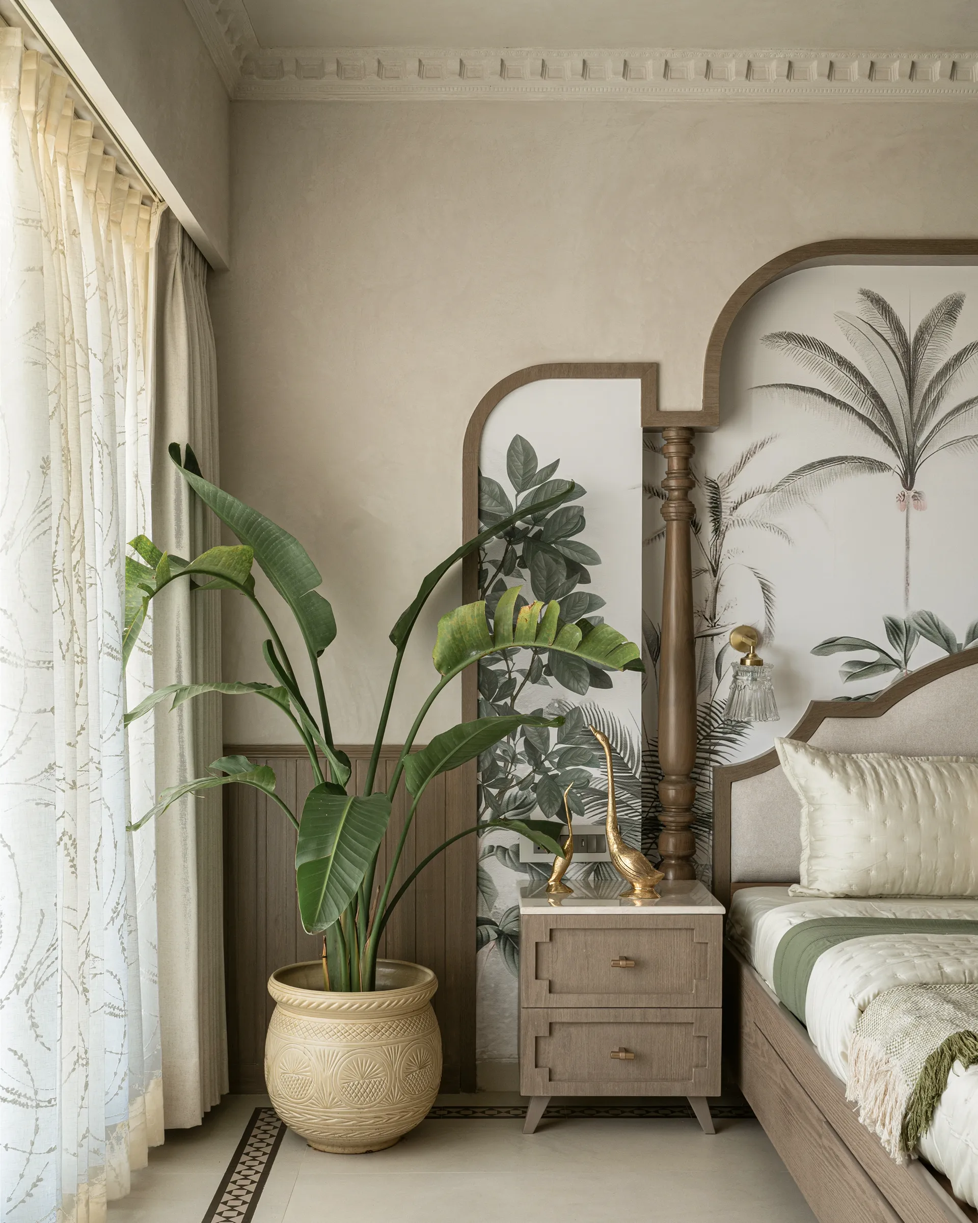 carefree vibe. Every corner of the room tells a story—from the inlay tiles that echo the beige flooring to the soft, flowing tree branches behind the bed, a tribute to beginnings, growth, and