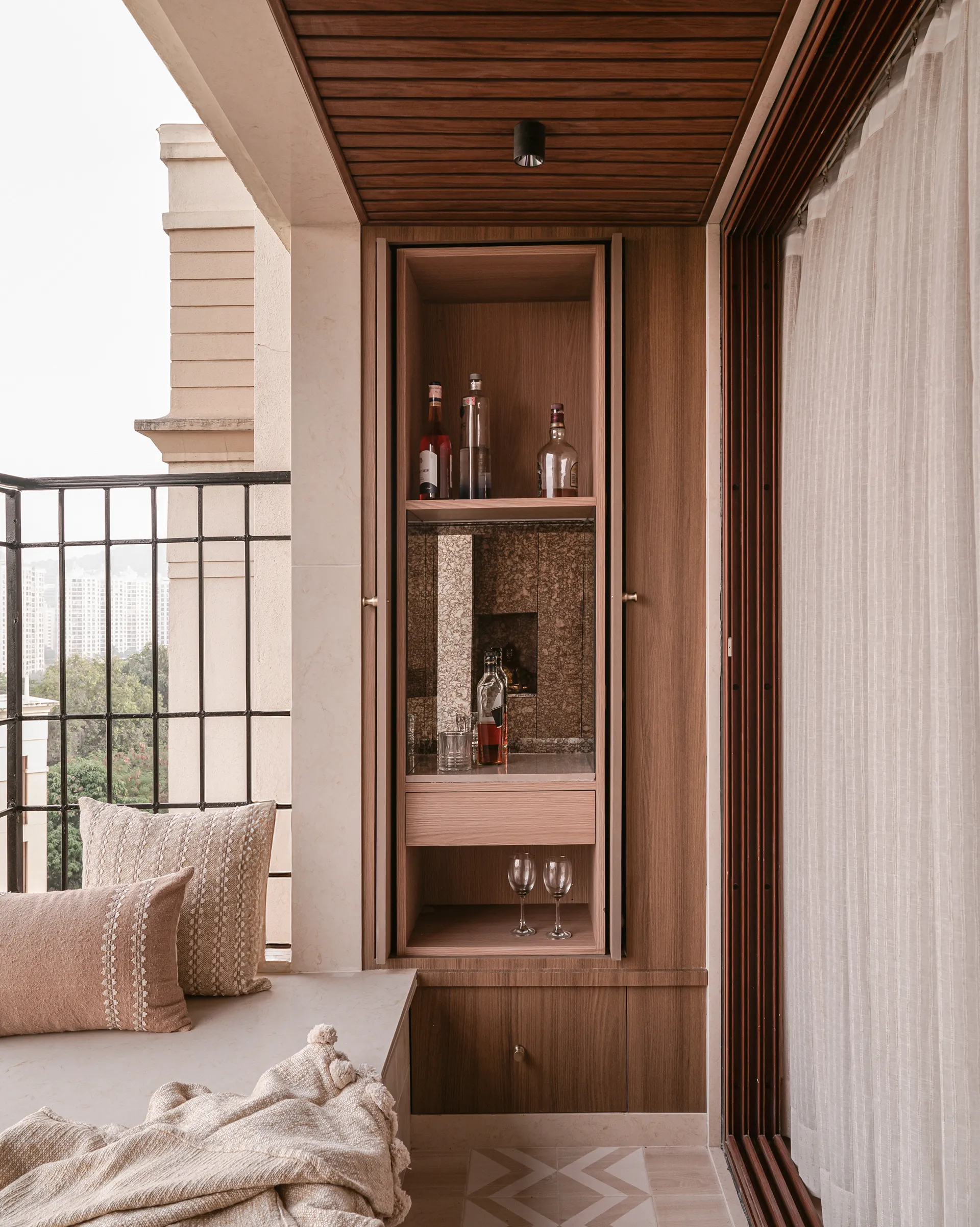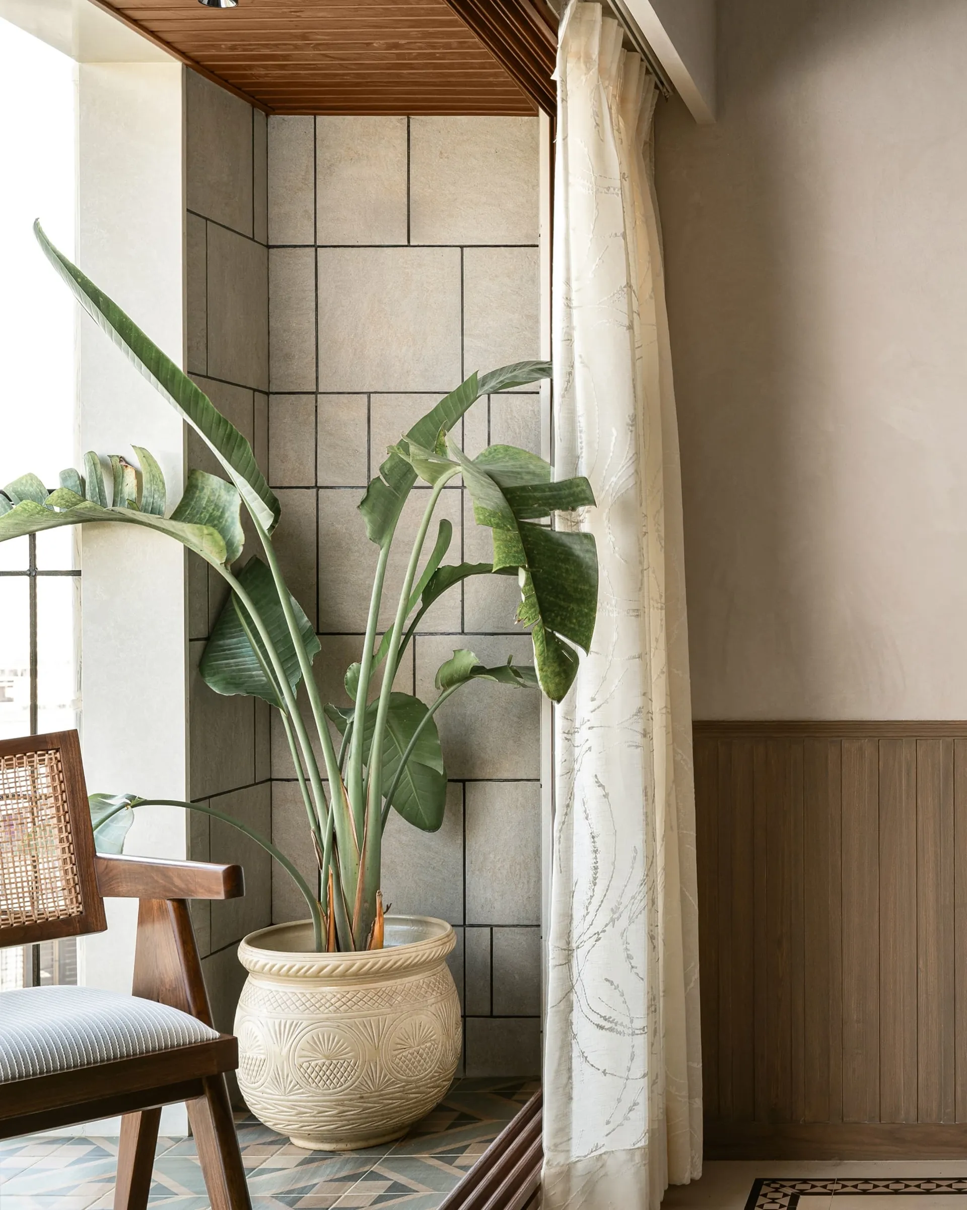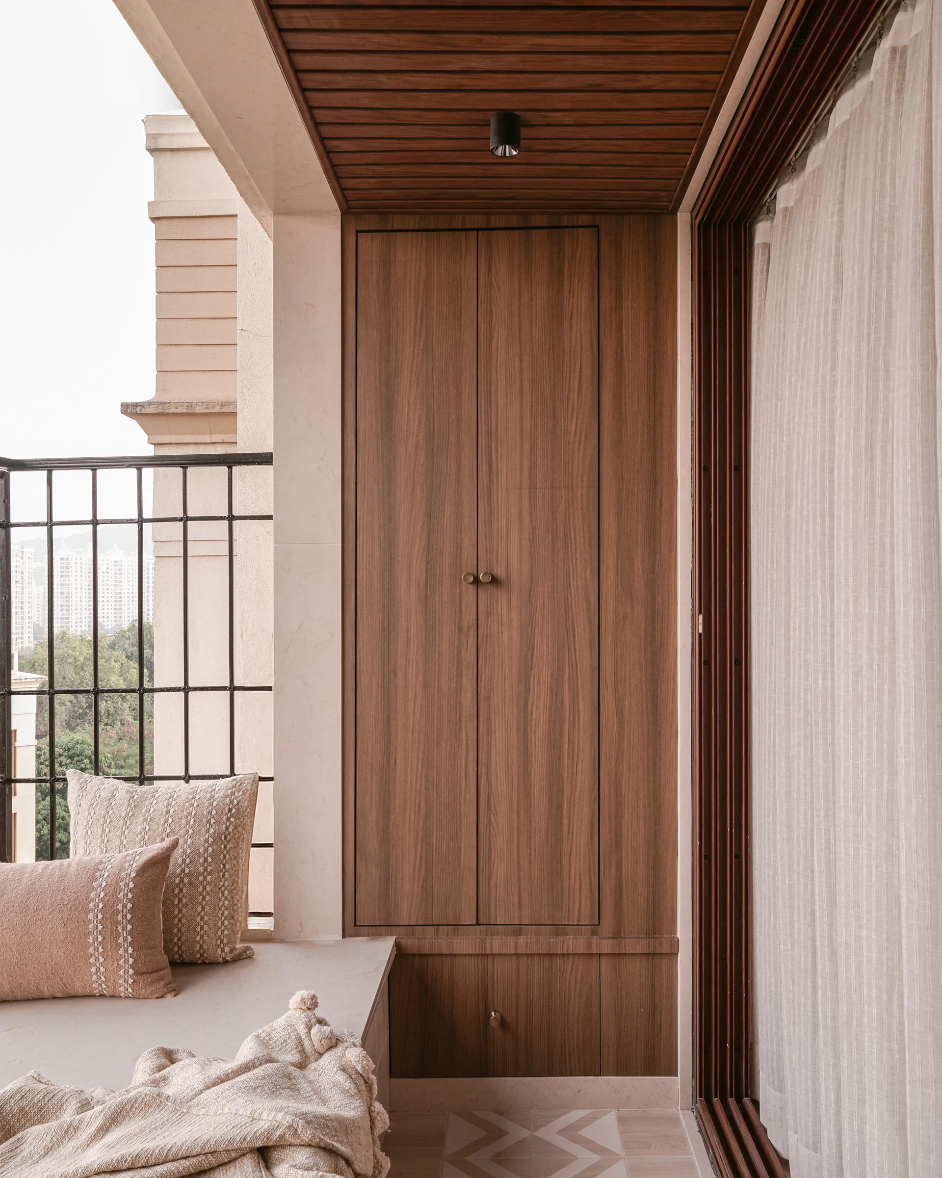 The dining room is where function meets art. A unique wood-and-marble dining table serves as the centrepiece. The chairs, made of organic cotton, wood, and cane, are a testament to sustainability, while the bespoke veneer detailing on the sideboard and doors adds a layer of sophistication. The most delightful surprise? A spacious, broad balcony—once a