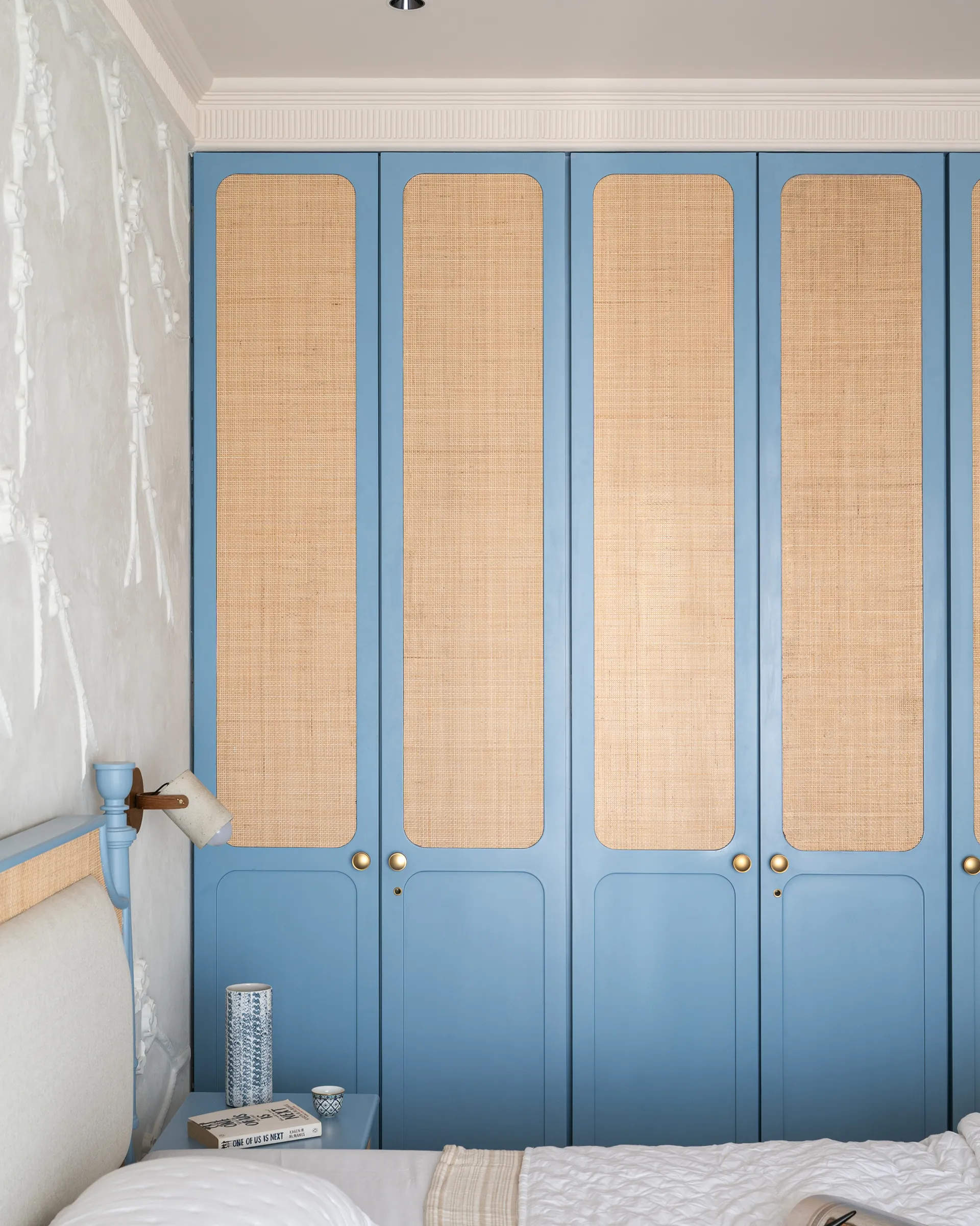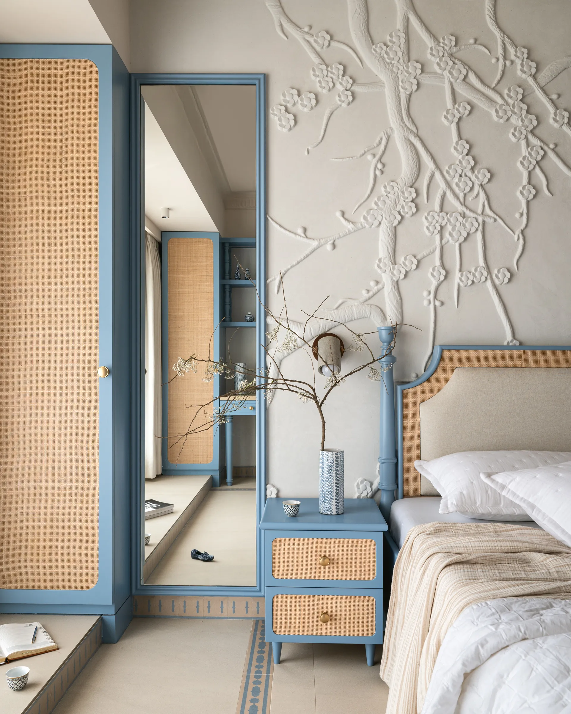 of beige accents in the headboard and inlay tiles creates a perfect balance of calm and creativity. The room feels like a breath of fresh air, with cane details that evoke an earthy,