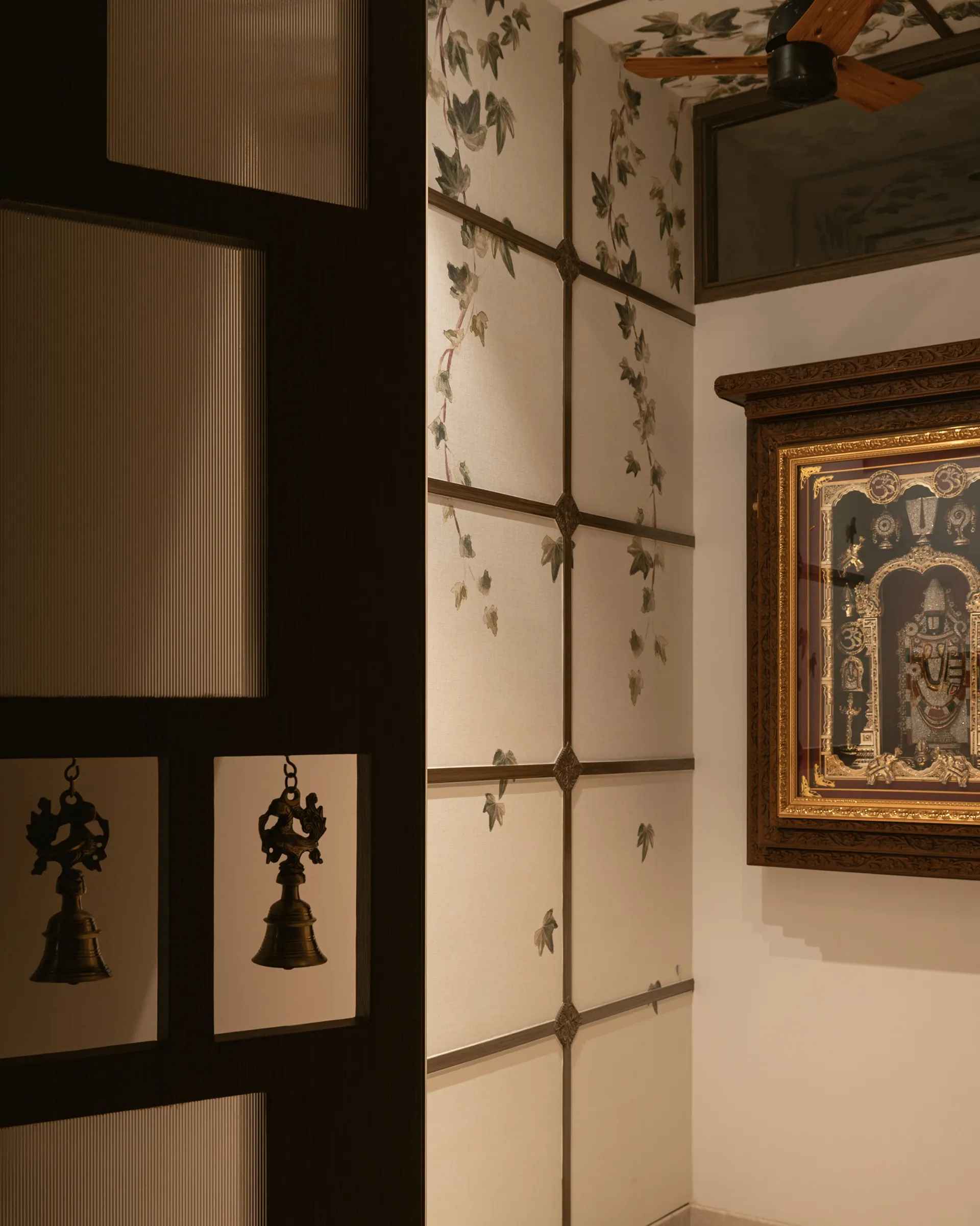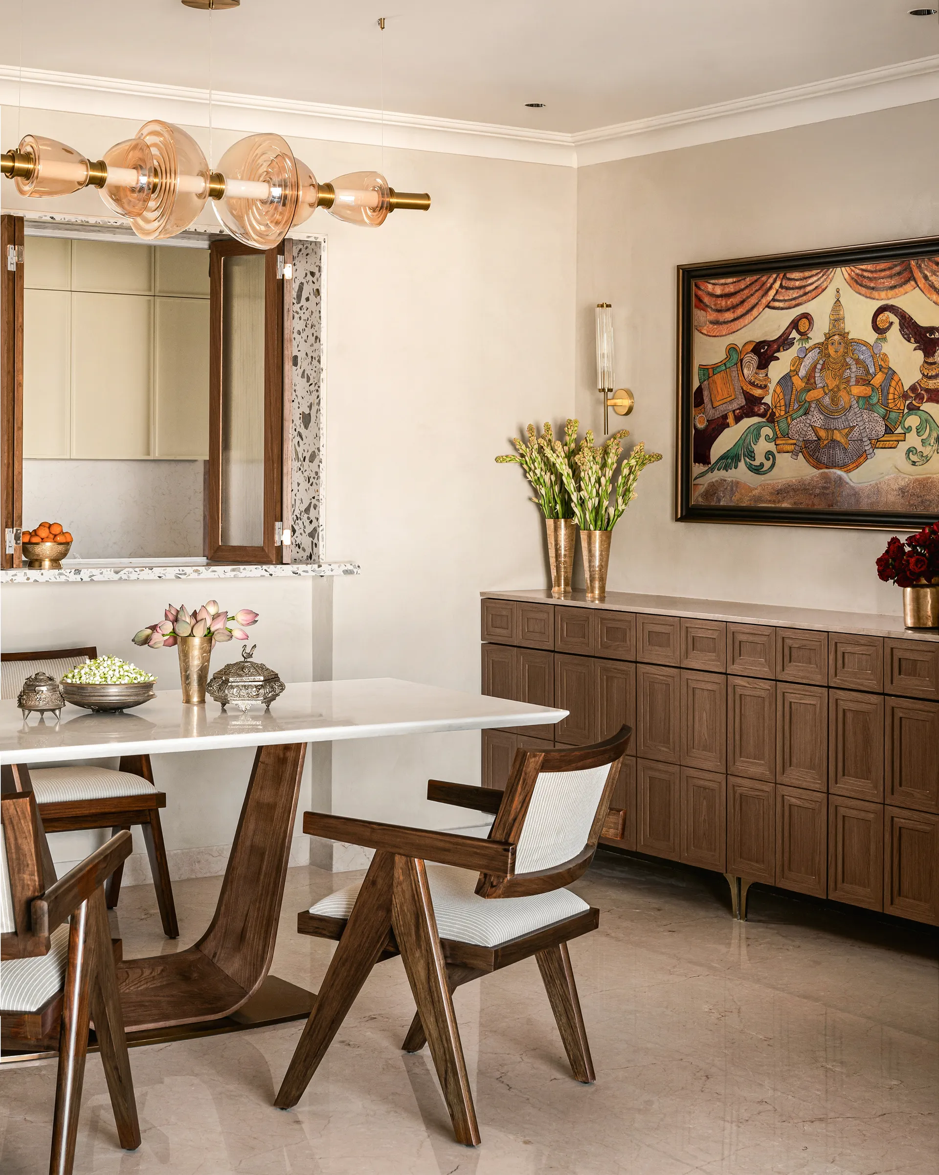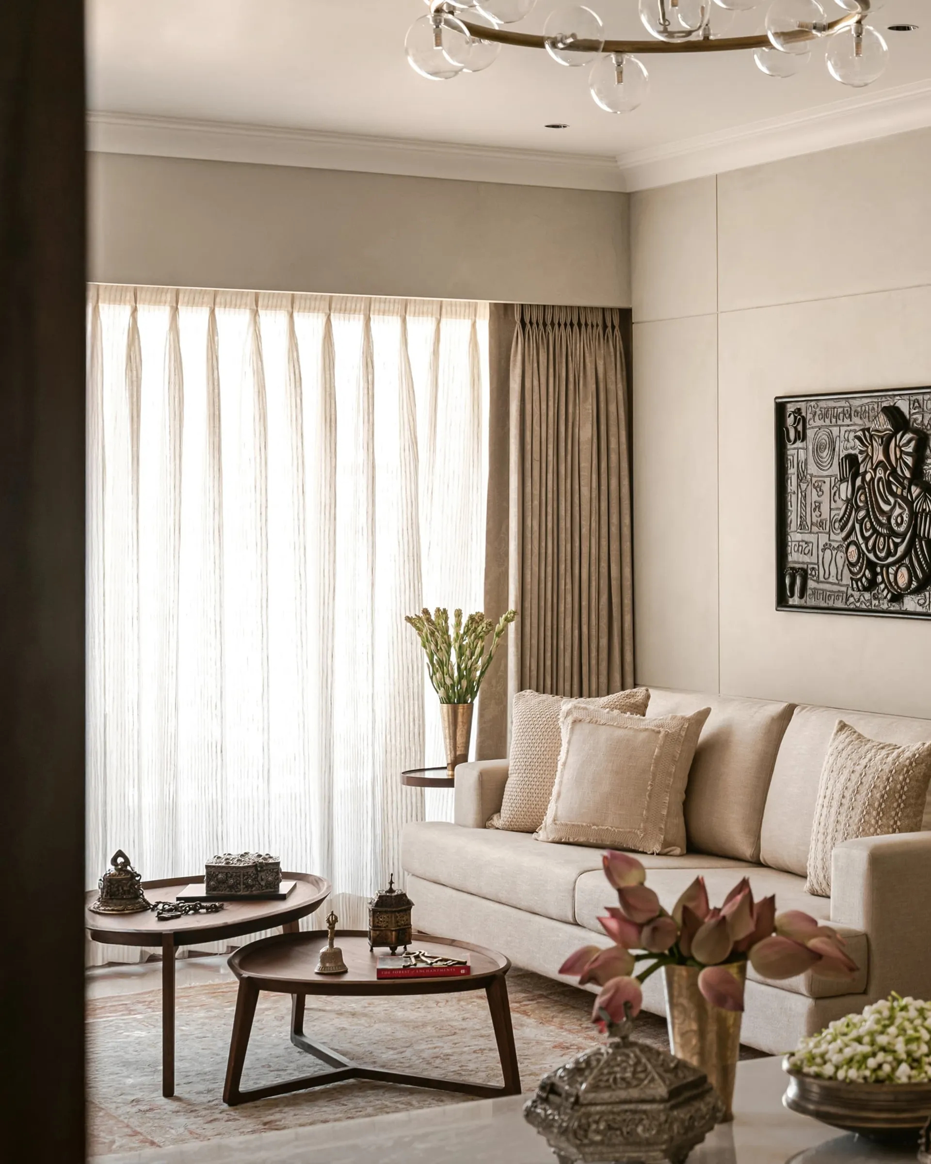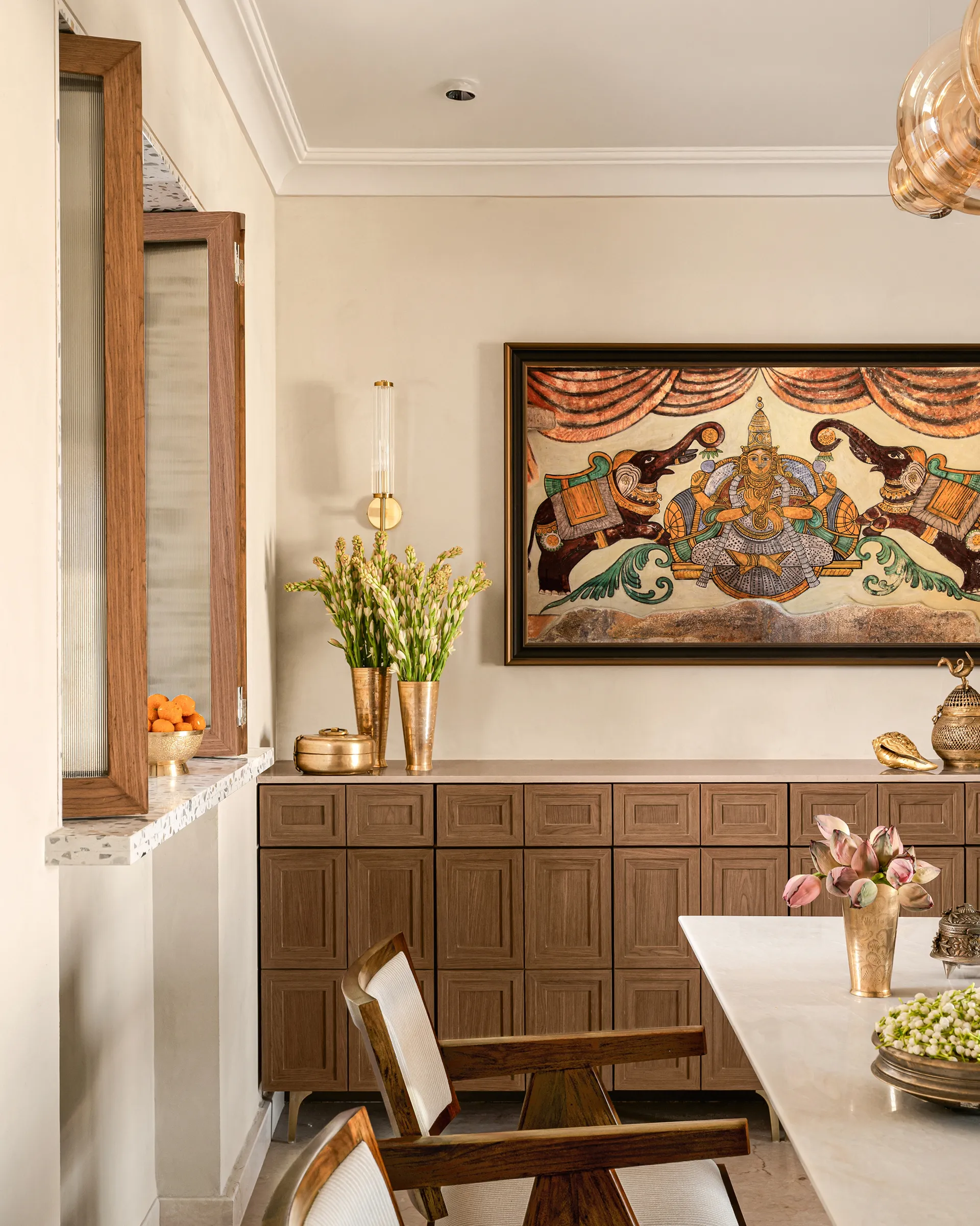 As you step into the heart of the home, the entrance welcomes you with a traditional mandir, standing as a sacred space with two grand pillars that nod to South Indian architecture and