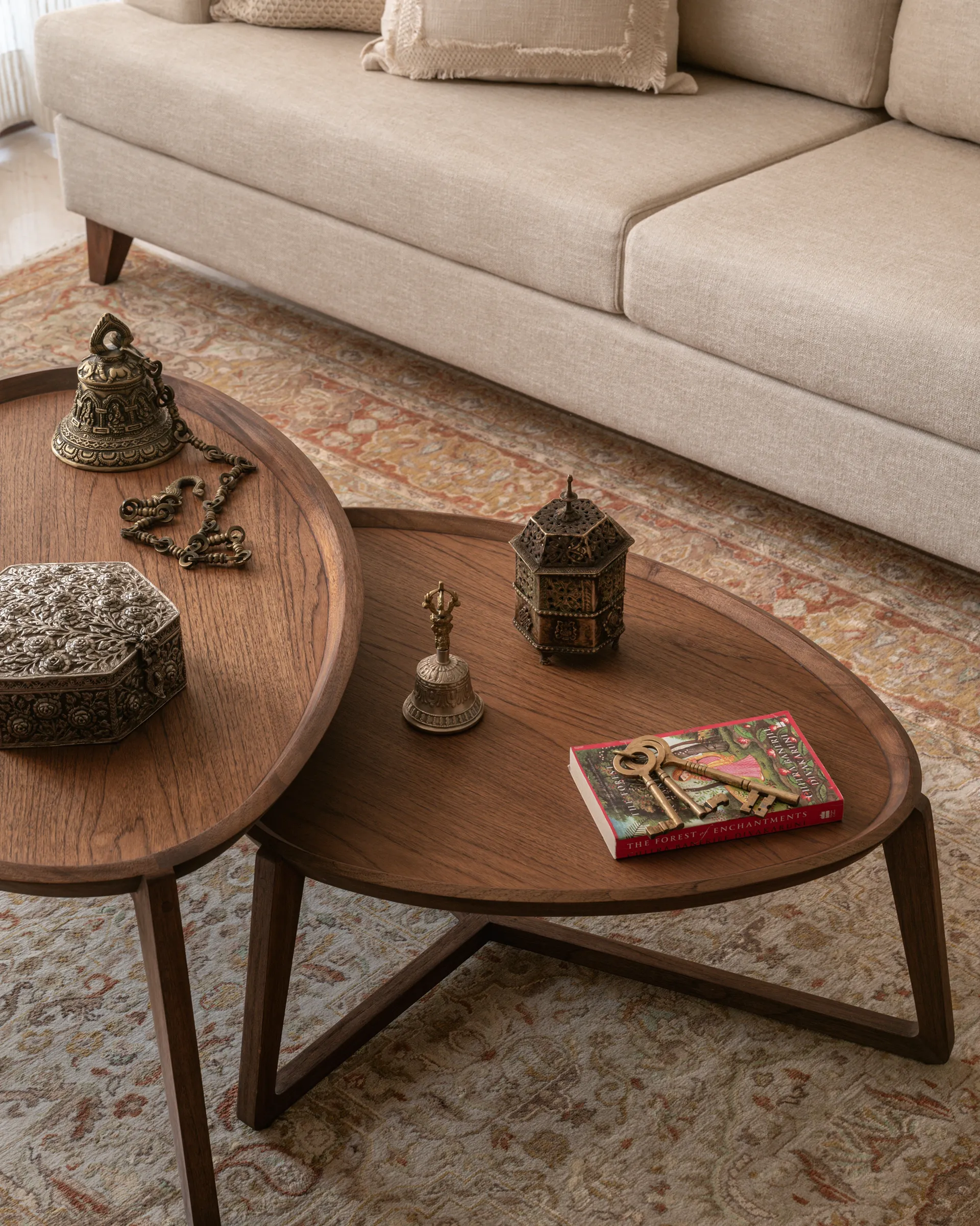 delicate bells that chime softly, bringing an authentic touch of spirituality and serenity to the home. The living room invites you with its warm wooden furniture, each piece handpicked to