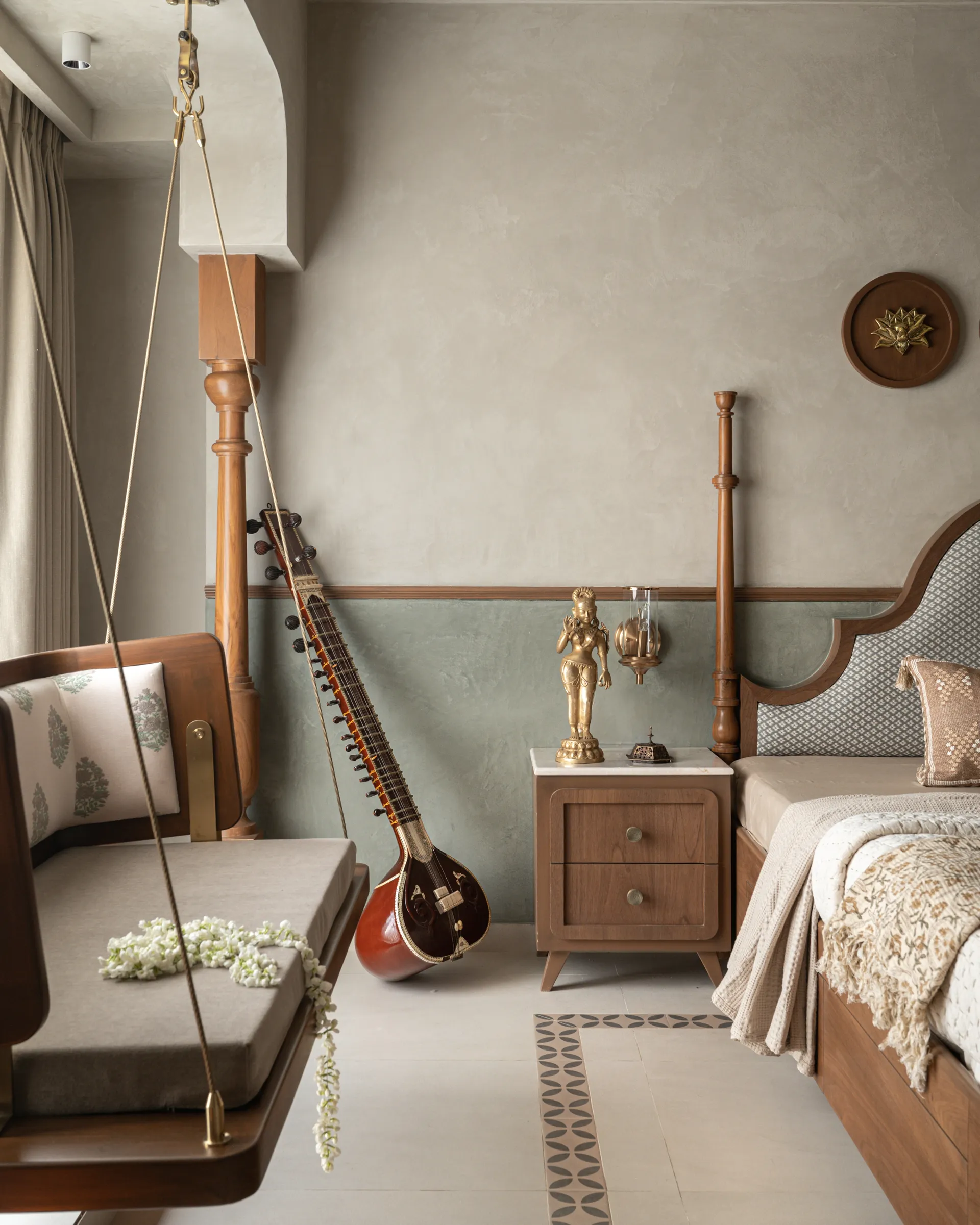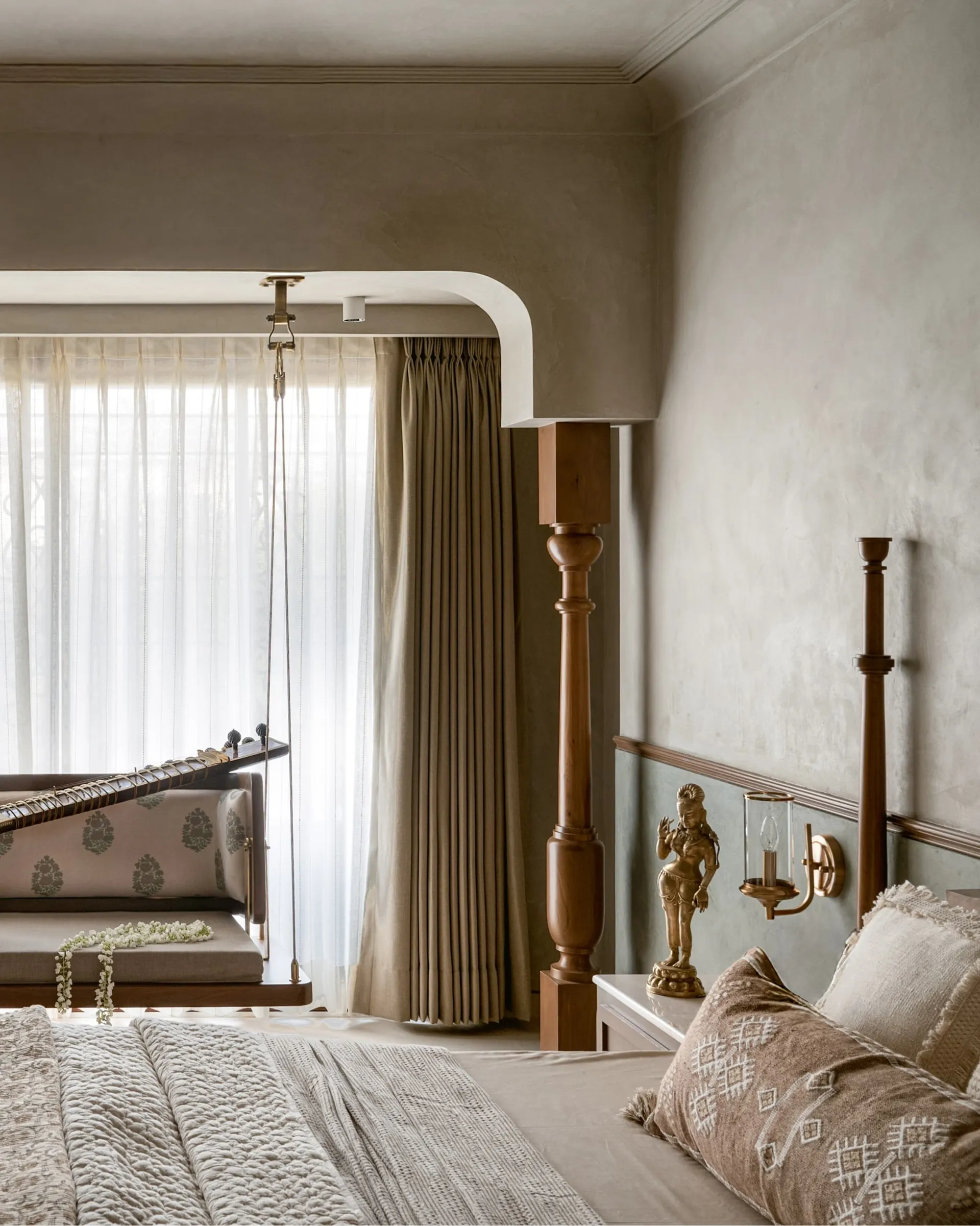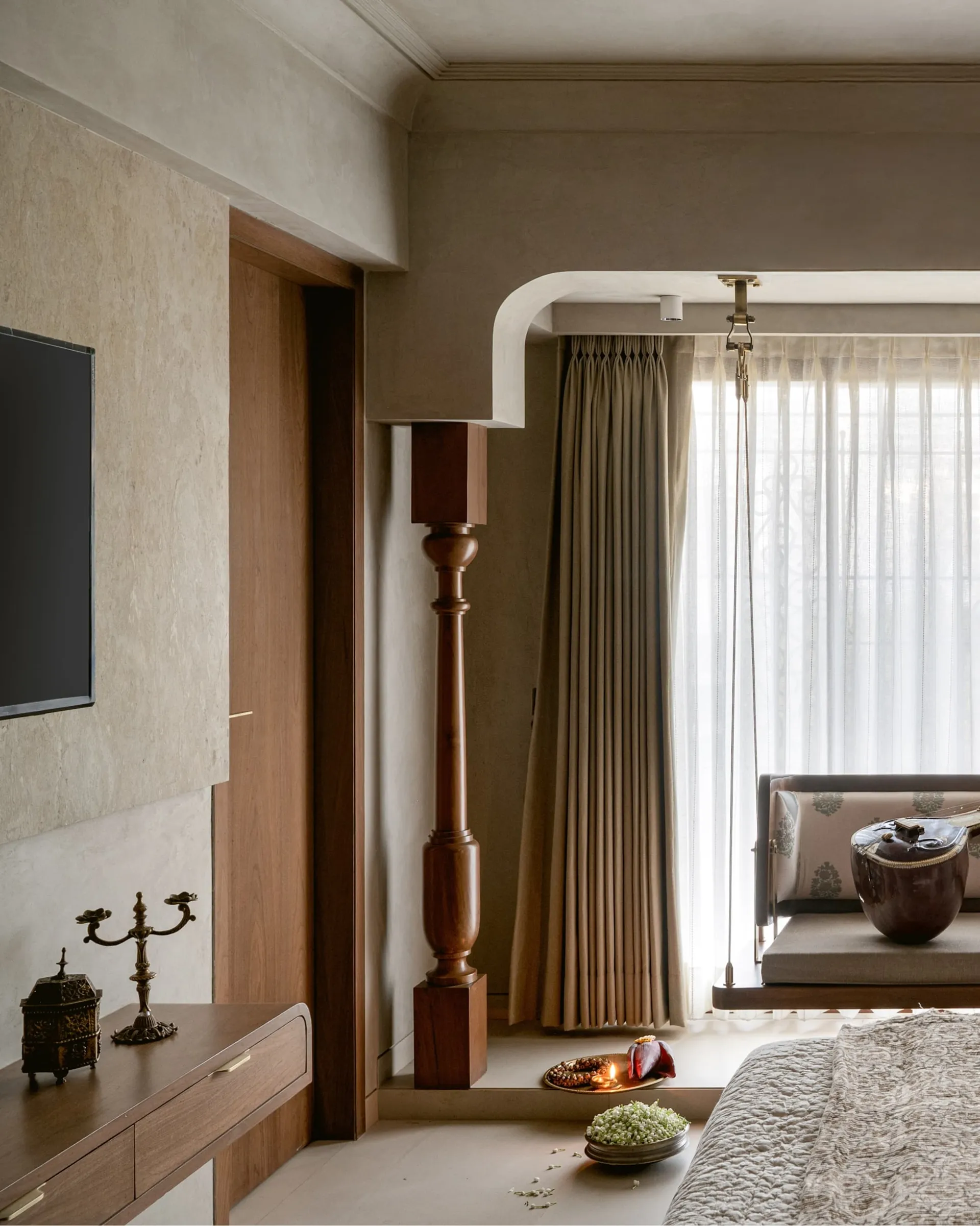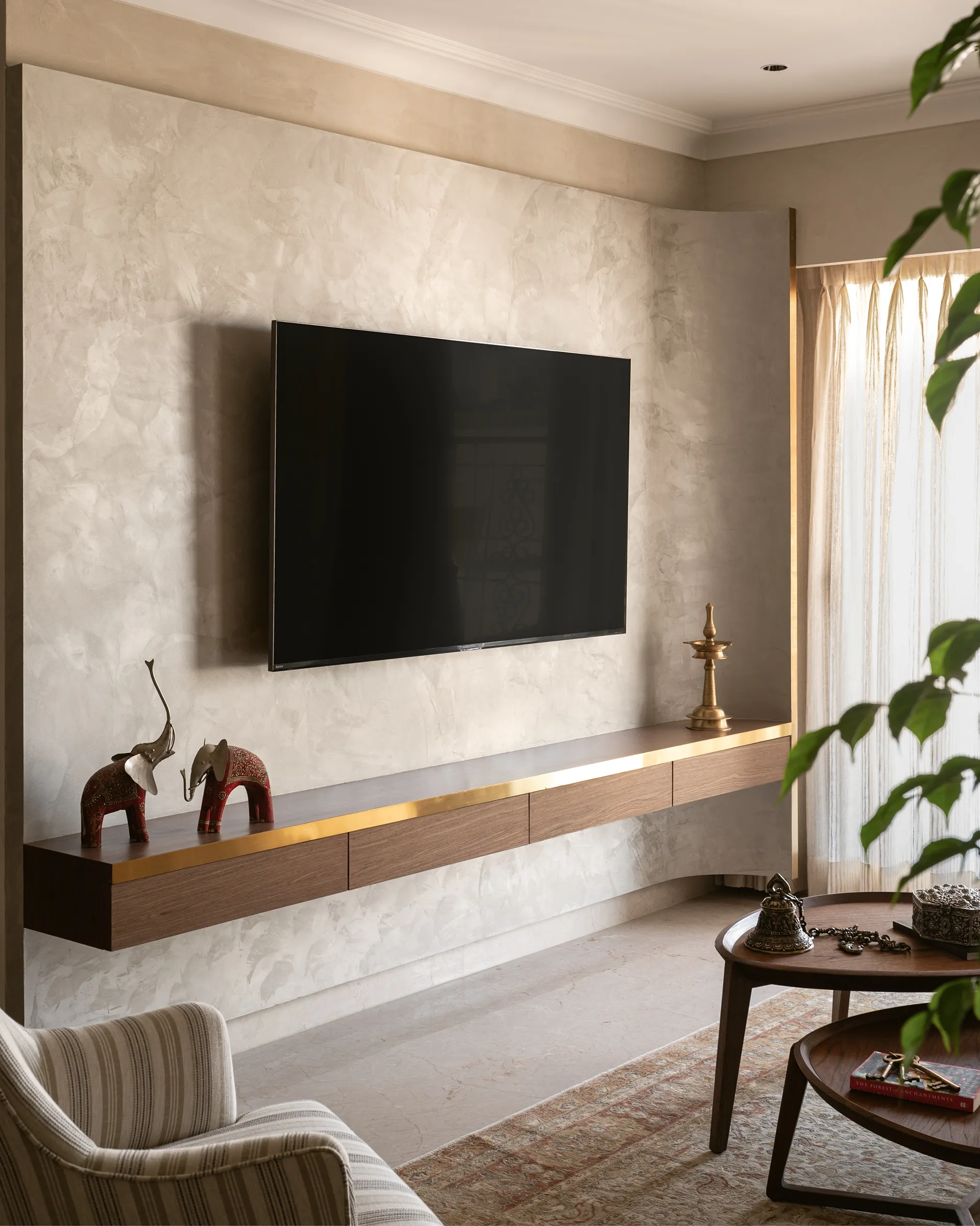evoke a sense of nostalgia and warmth. The curved TV unit, a modern marvel in design, serves as a bridge between past and present, while the brass pattis embedded in the space bring a touch of South Indian heritage, grounding the entire room in tradition. The limewash-finished textured walls, with their subtle depth and character, add warmth and richness. The rug—a stunning fusion of bamboo silk—wraps the space in a tactile experience that feels both luxurious and organic.