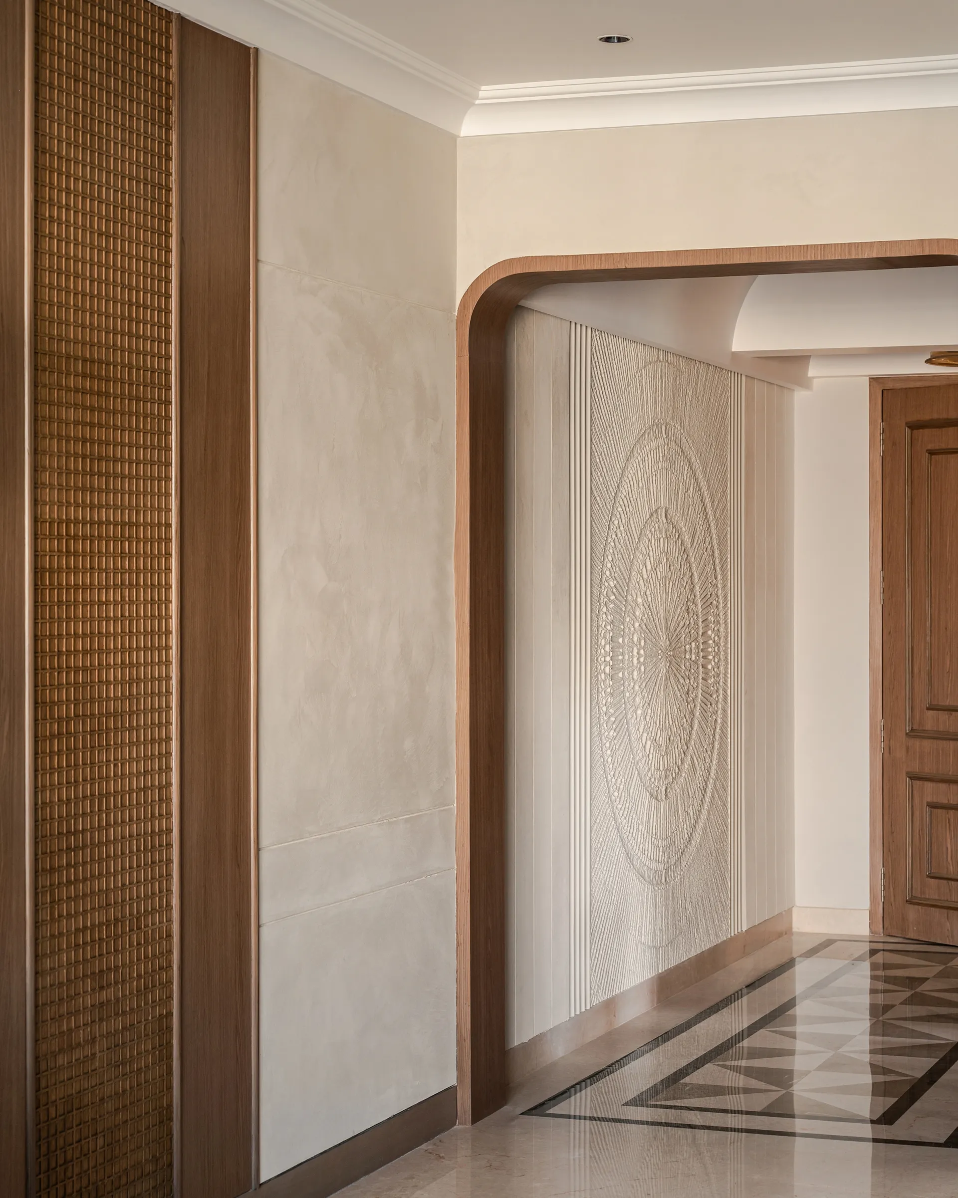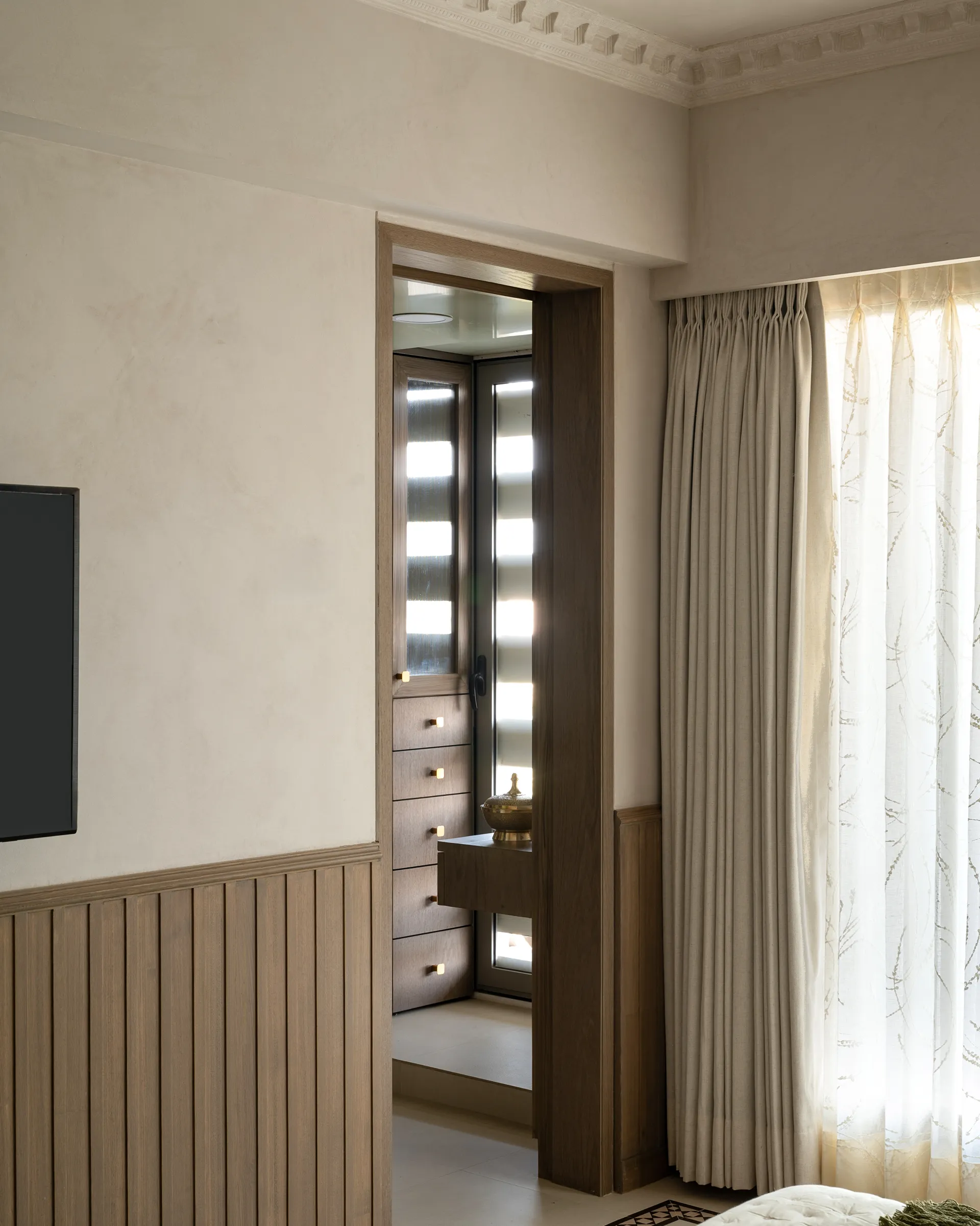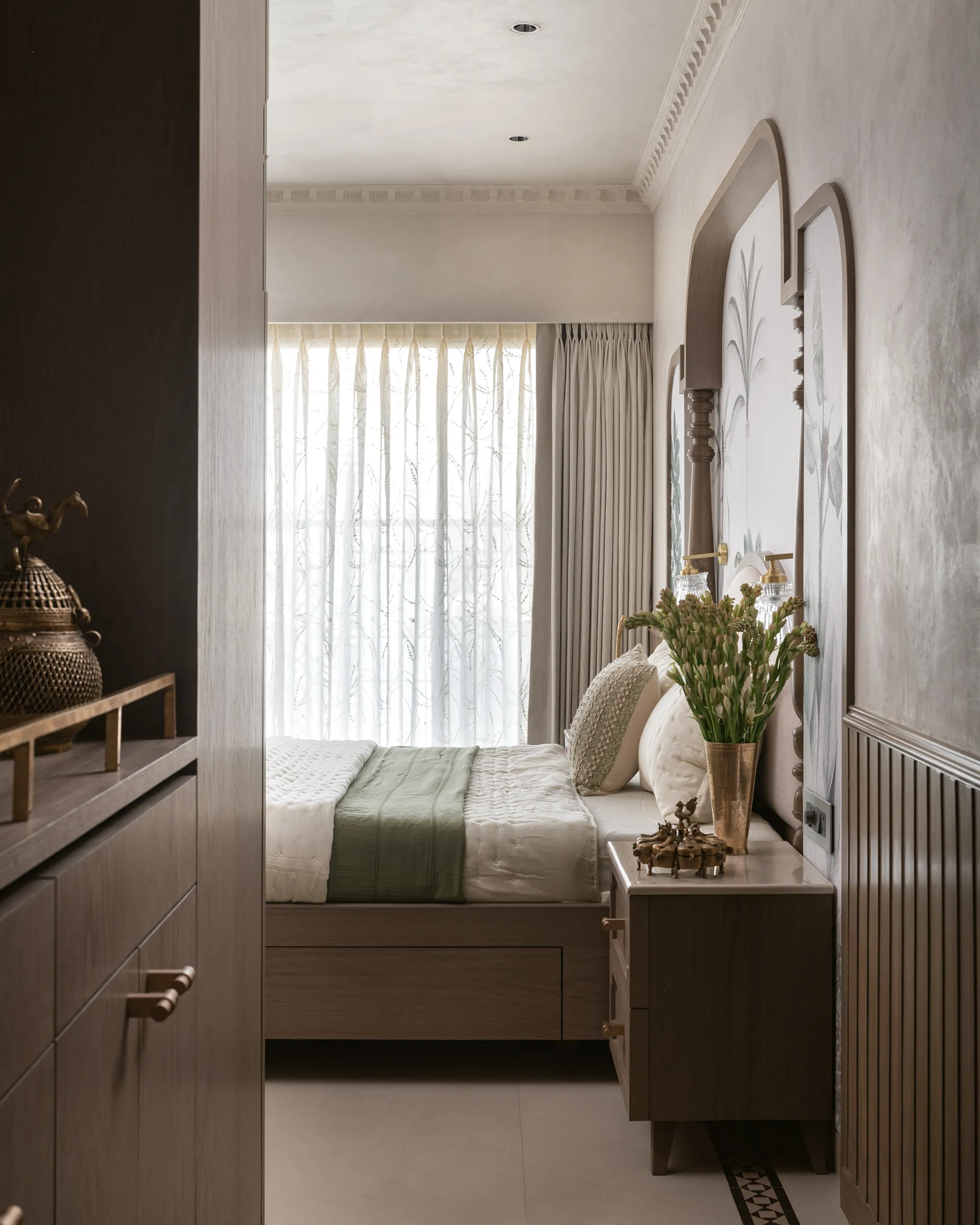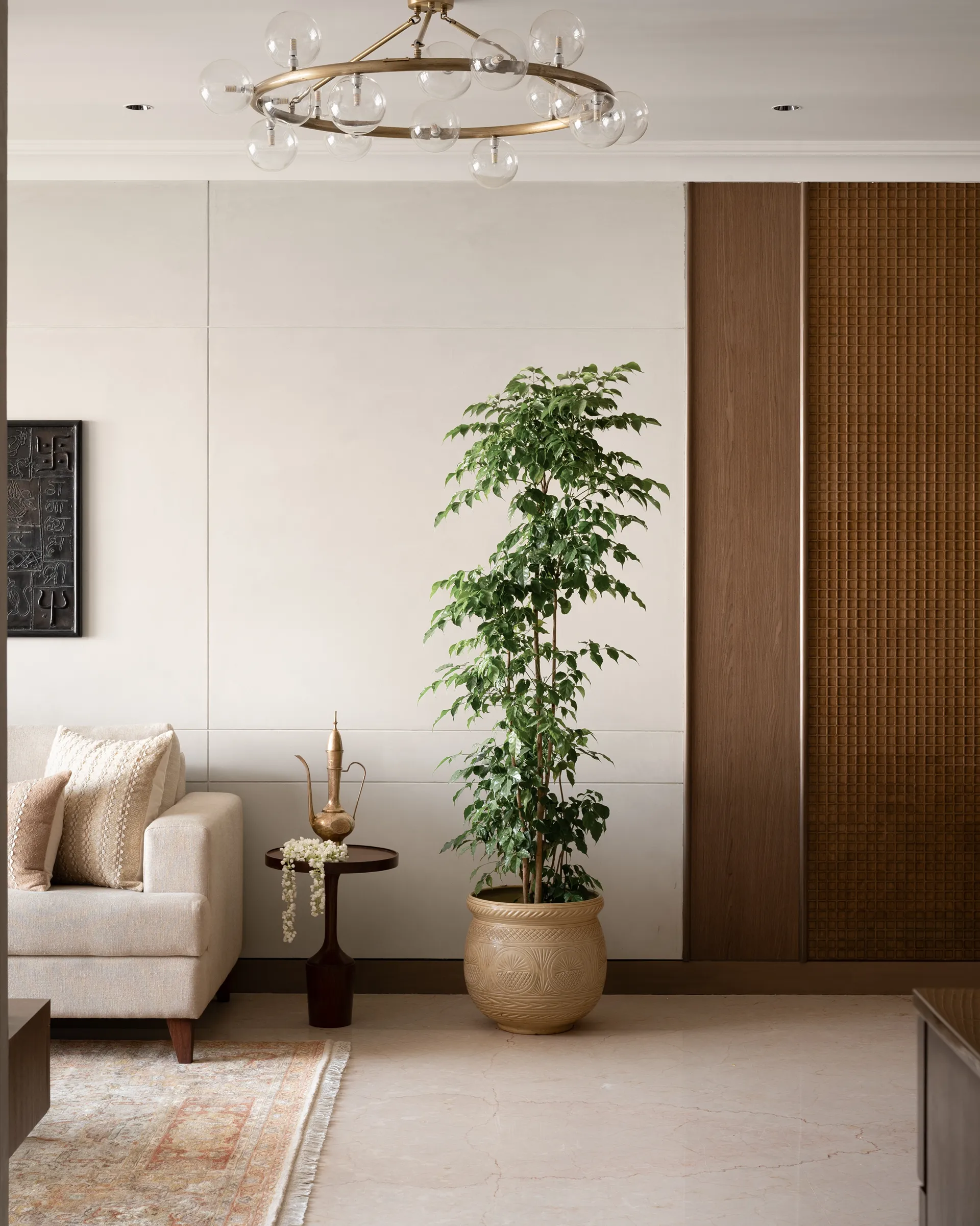 evoke a sense of nostalgia and warmth. The curved TV unit, a modern marvel in design, serves as a bridge between past and present, while the brass pattis embedded in the space bring a touch of South Indian heritage, grounding the entire room in tradition. The limewash-finished textured walls, with their subtle depth and character, add warmth and richness. The rug—a stunning fusion of bamboo silk—wraps the space in a tactile experience that feels both luxurious and organic.