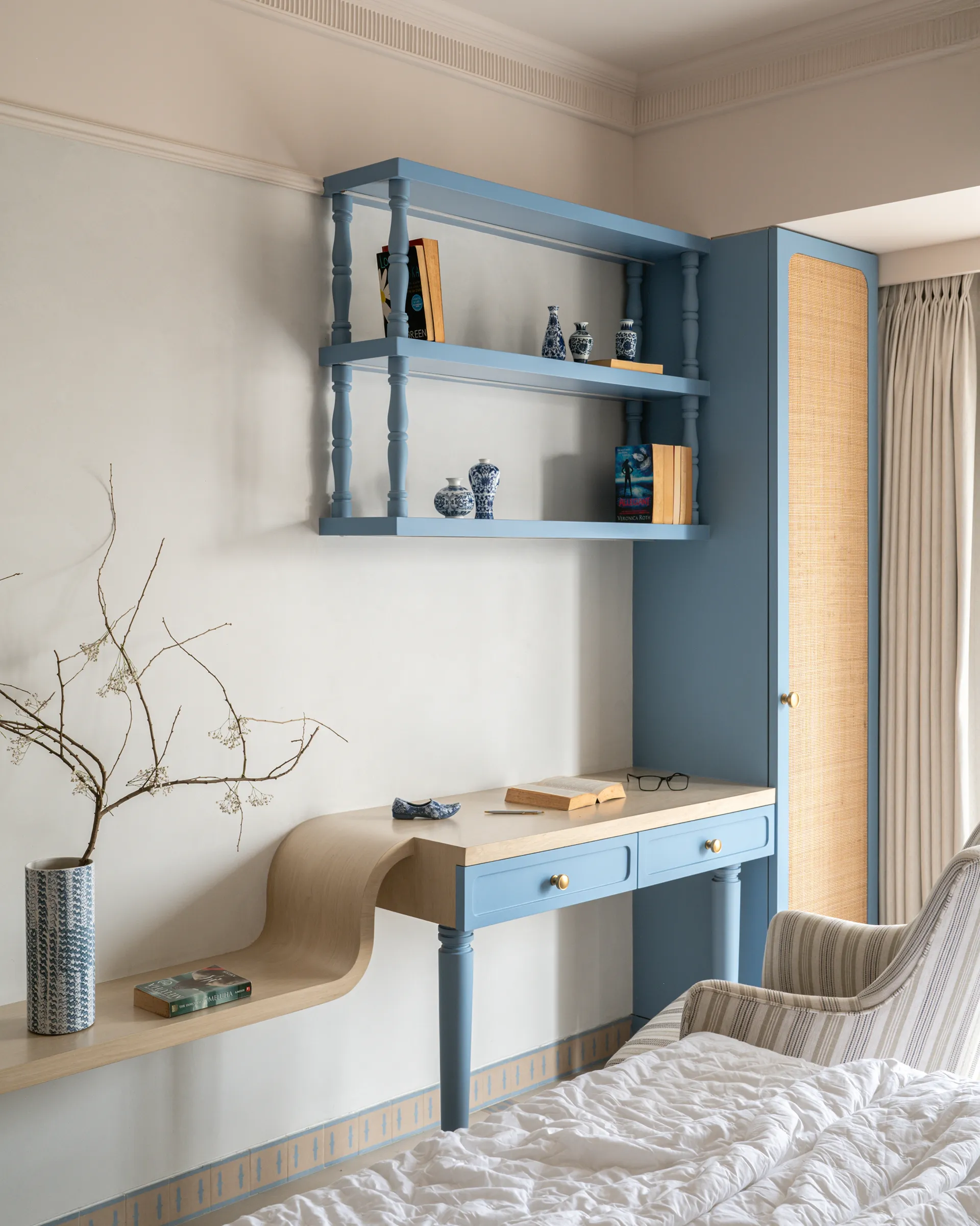 The daughters’ room is a bold departure from the rest of the home, a reflection of their boho-chic spirit and vibrant personalities. Blue PU cabinets set the tone, while the interplay