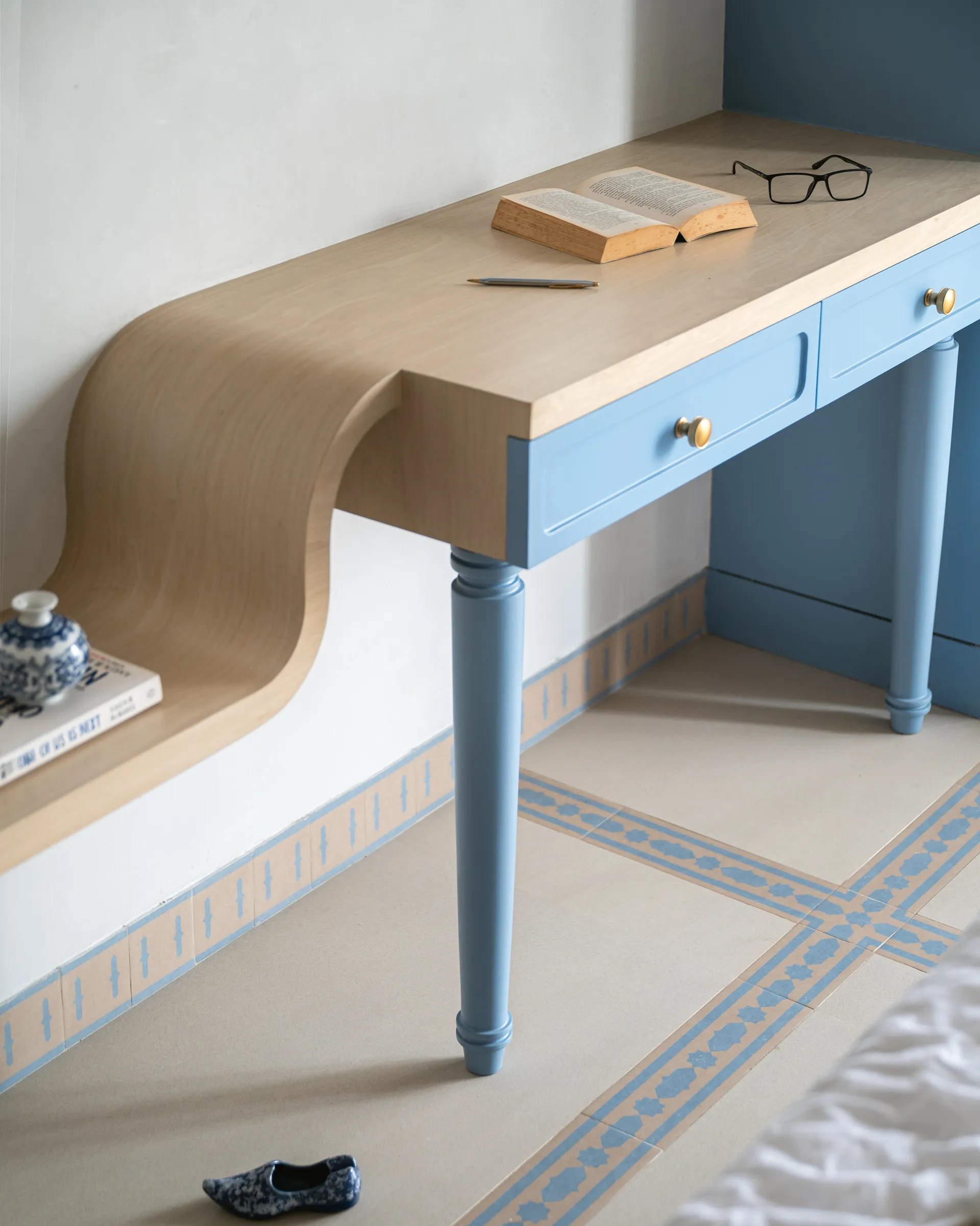 endless possibilities. It’s a space that feels entirely their own, yet still anchored in the larger narrative of the home. The study unit flows effortlessly into a curved TV unit, creating a